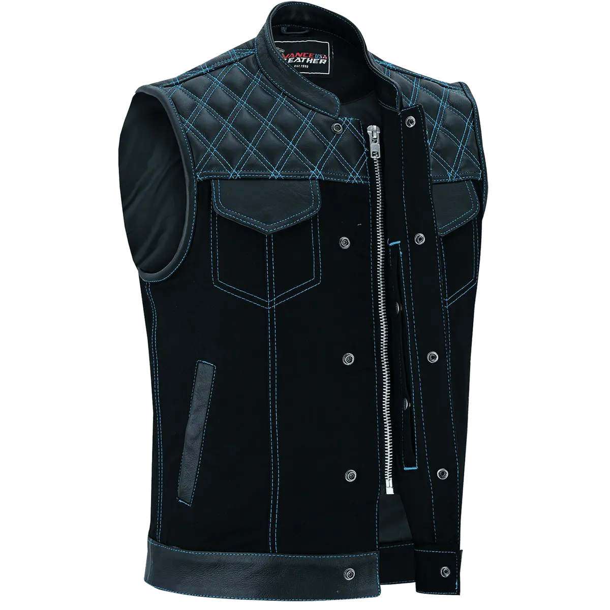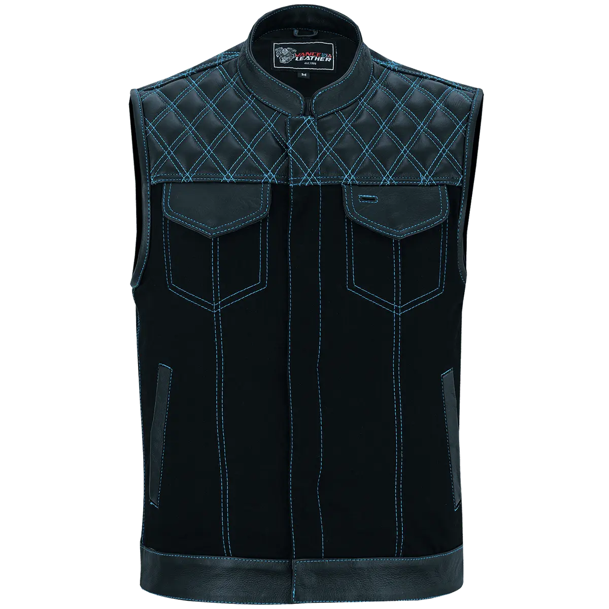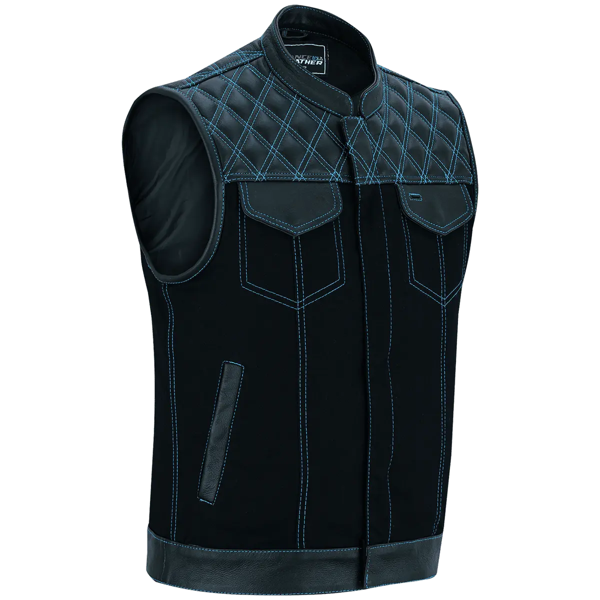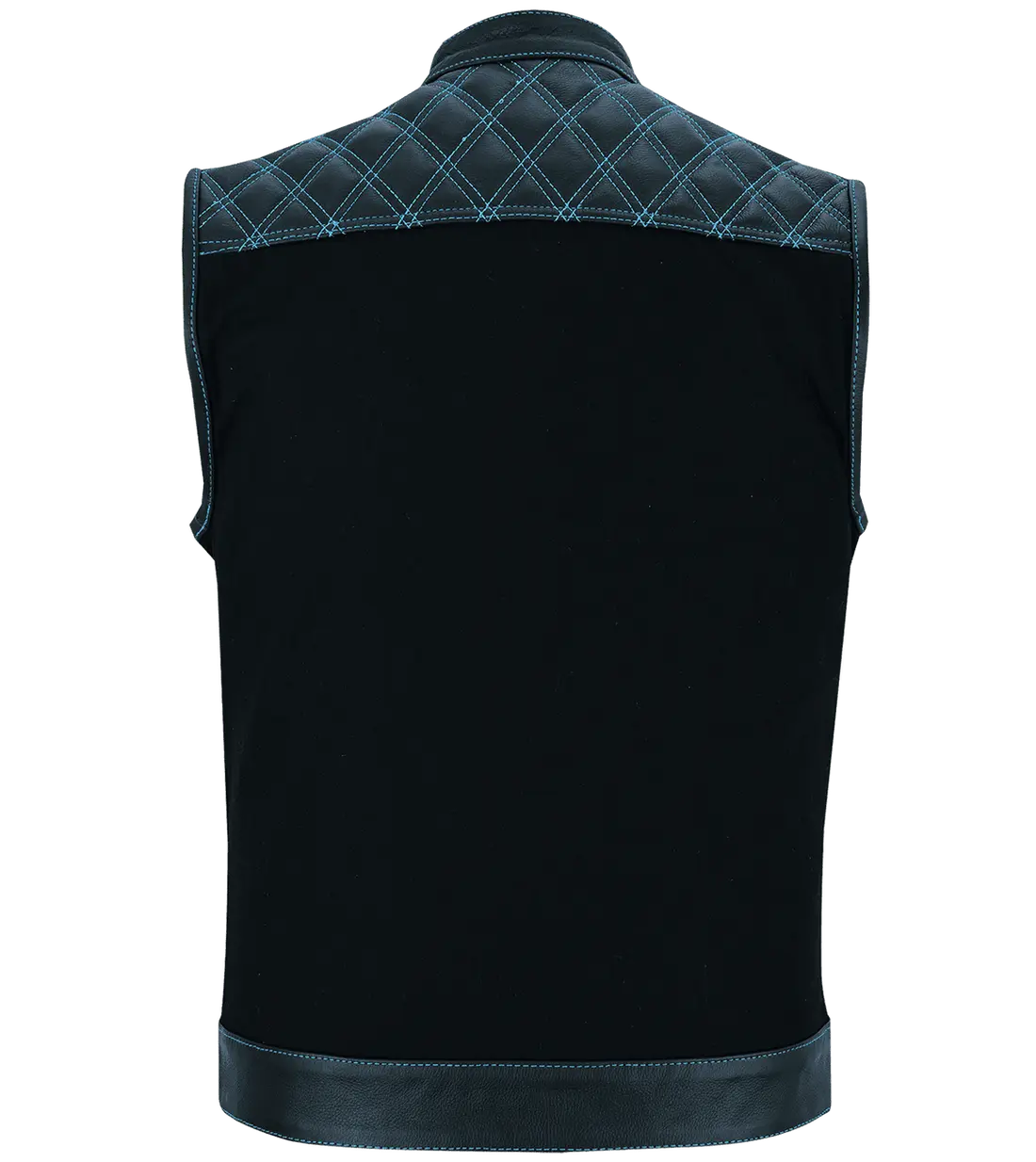 Men's Denim & Leather Motorcycle Vest with CCW Pockets and Blue Stitching.