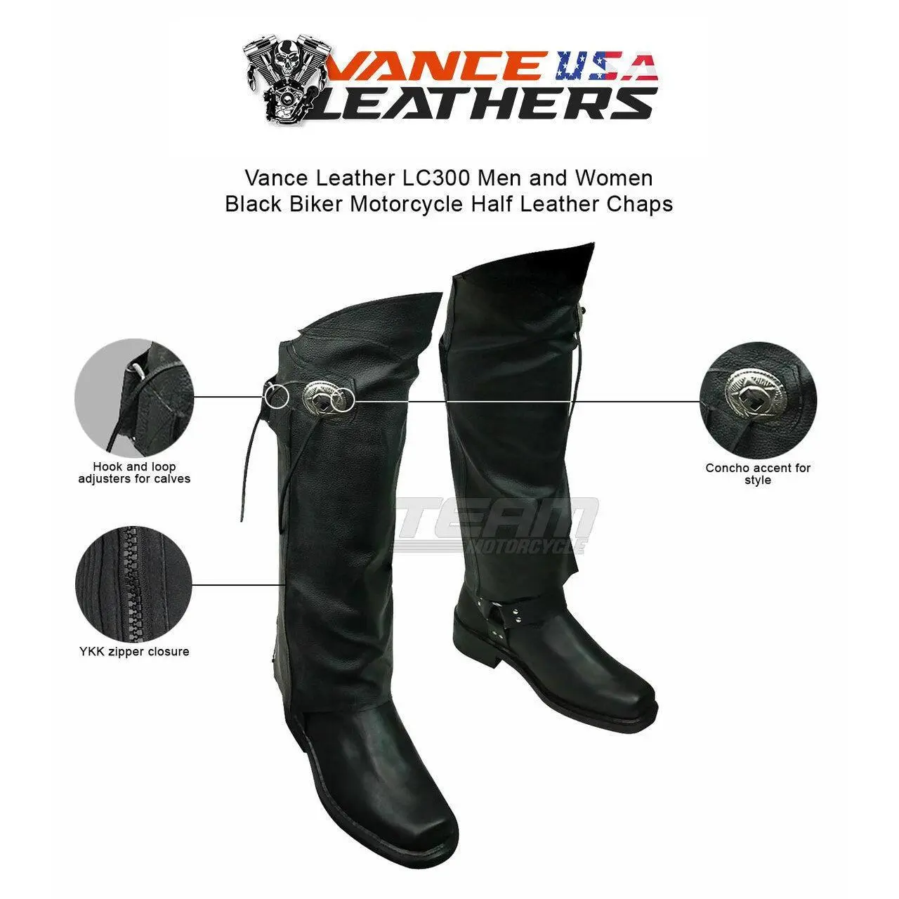 Vance Leather VL830 Men and Women Black Biker Motorcycle Half Leather Chaps.