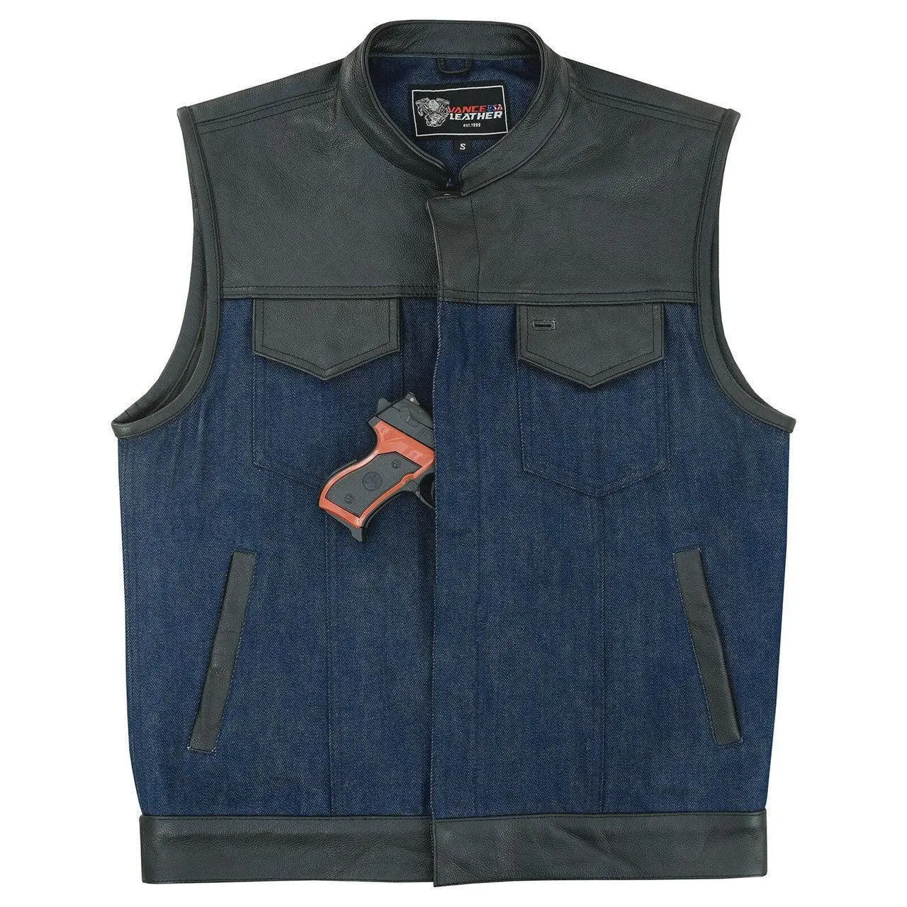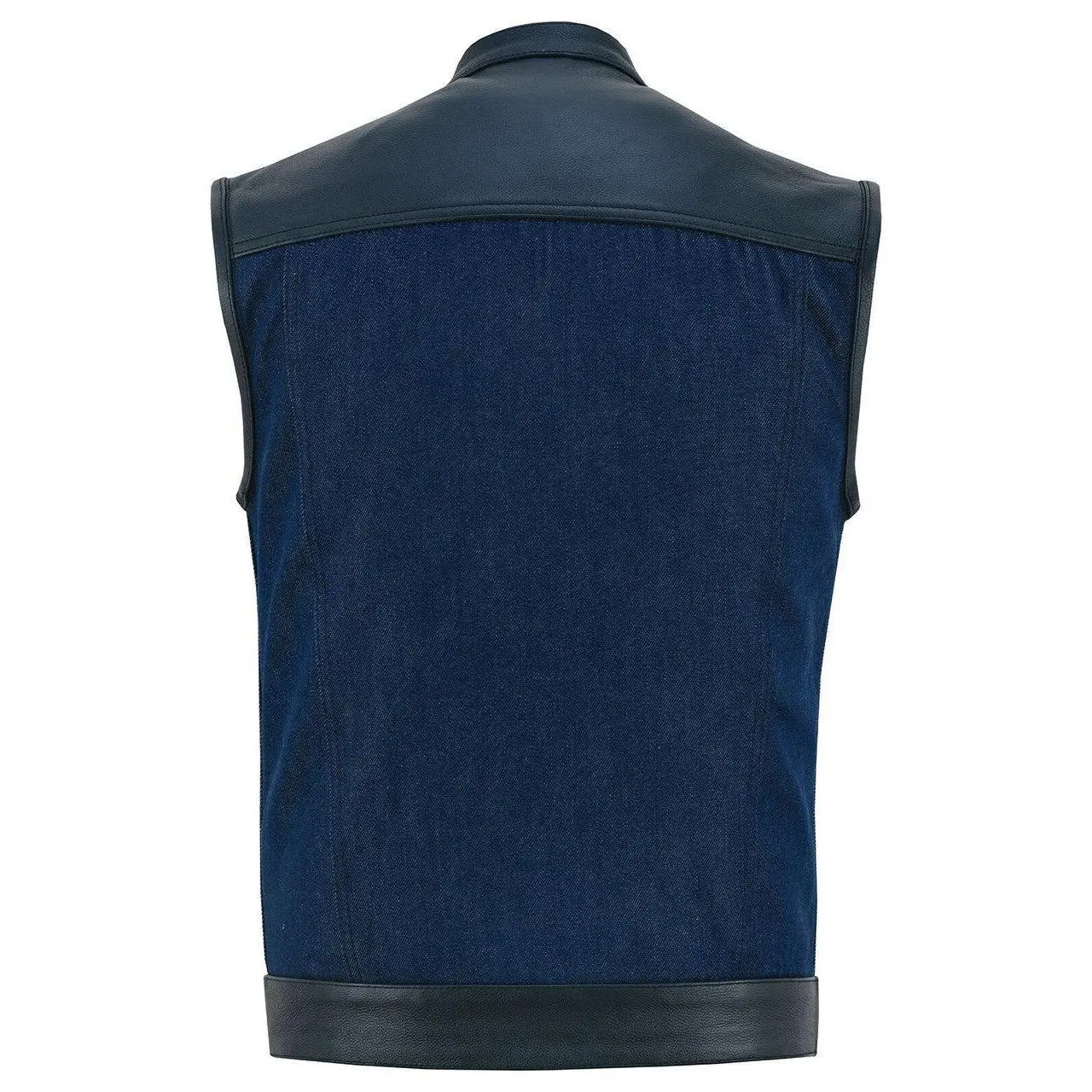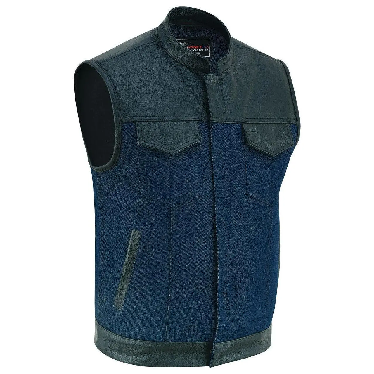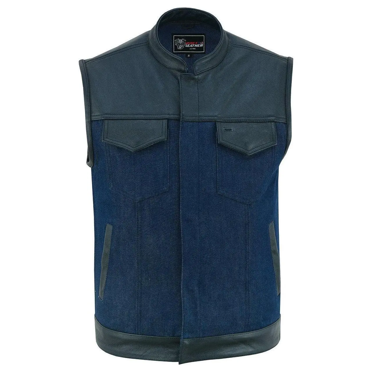 The Vance Denim Blue SOA Club Vest with Leather trims is the perfect accessory for any motorcycle rider looking for a stylish and functional vest. The vest is true to size, so you can be sure of a perfect fit. It features a euro collar design with covered snaps and a hidden zipper, giving it a sleek and modern look.