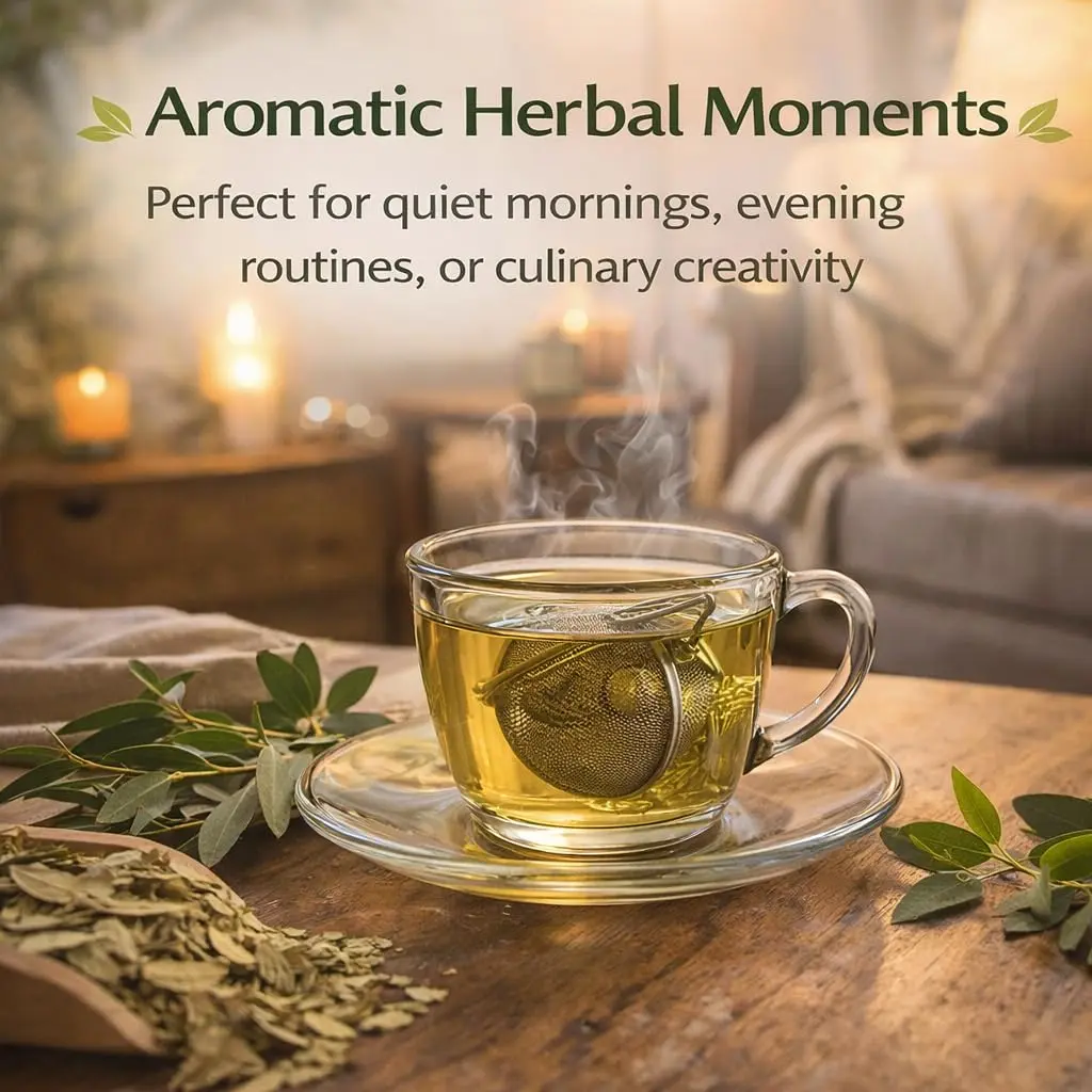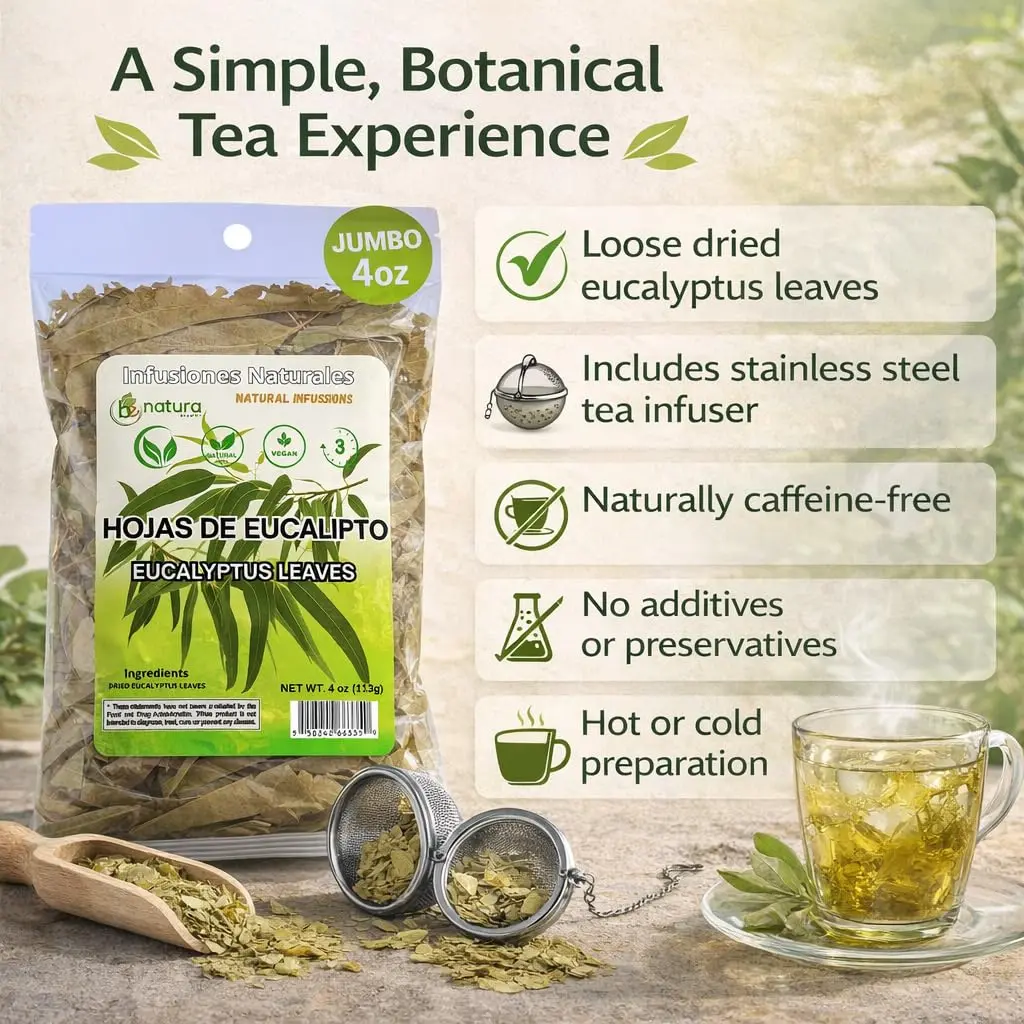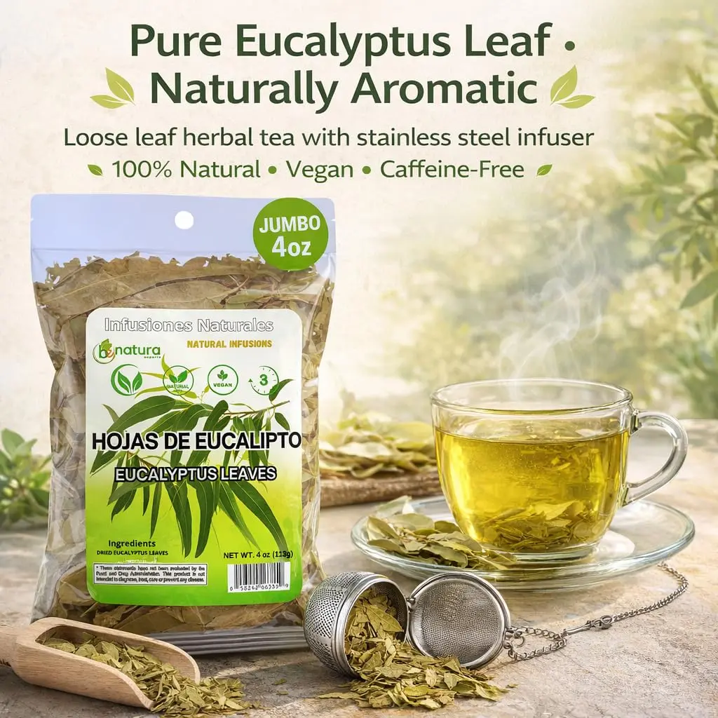 • Premium dried eucalyptus leaves ensure top-notch taste. • Stainless steel tea infuser makes steeping easy. • 4oz (113g) resealable bag keeps your tea fresh. • Comes with a tea infuser for convenience. • Enjoy as tea or use for aromatherapy.