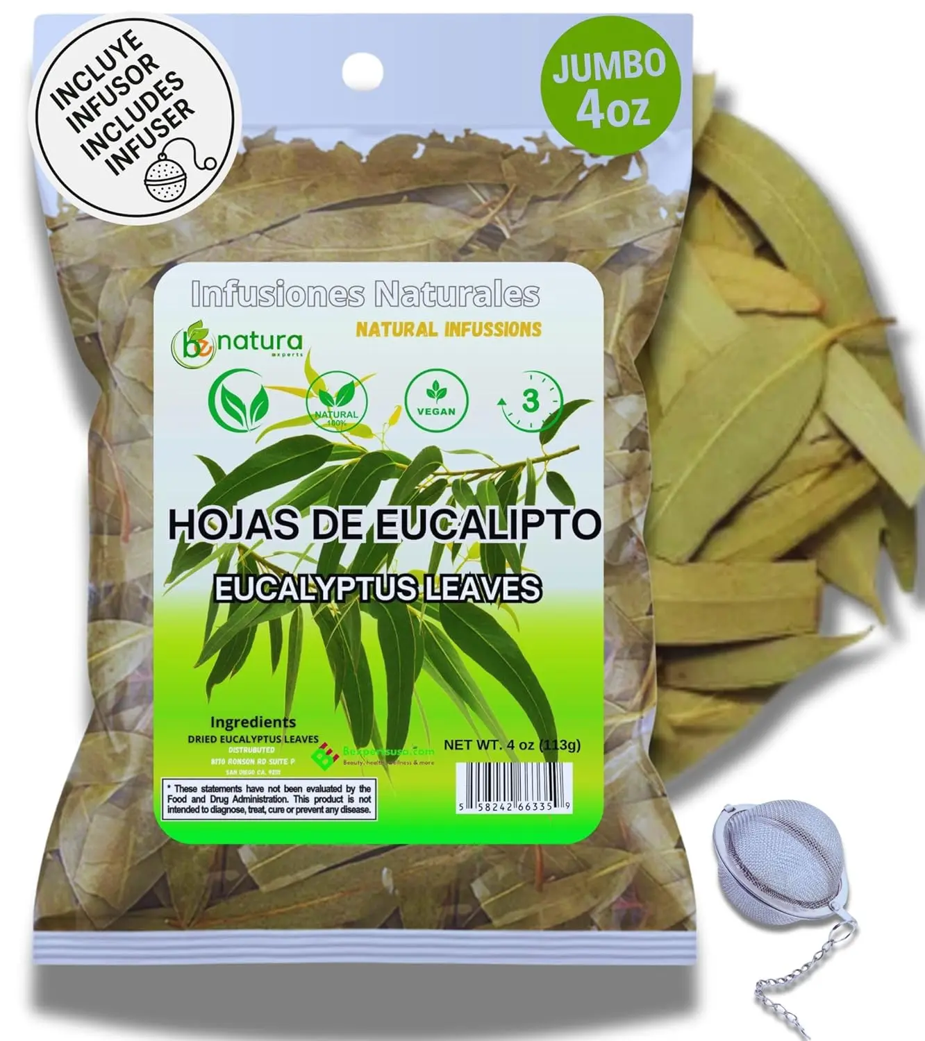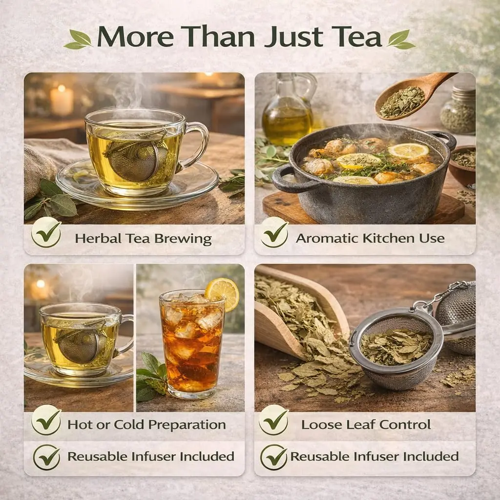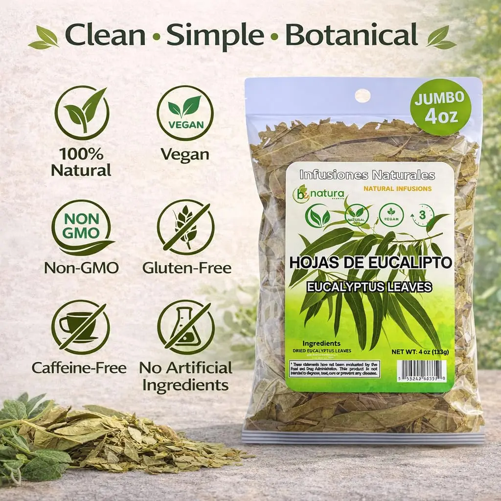 • Premium dried eucalyptus leaves ensure top-notch taste. • Stainless steel tea infuser makes steeping easy. • 4oz (113g) resealable bag keeps your tea fresh. • Comes with a tea infuser for convenience. • Enjoy as tea or use for aromatherapy.