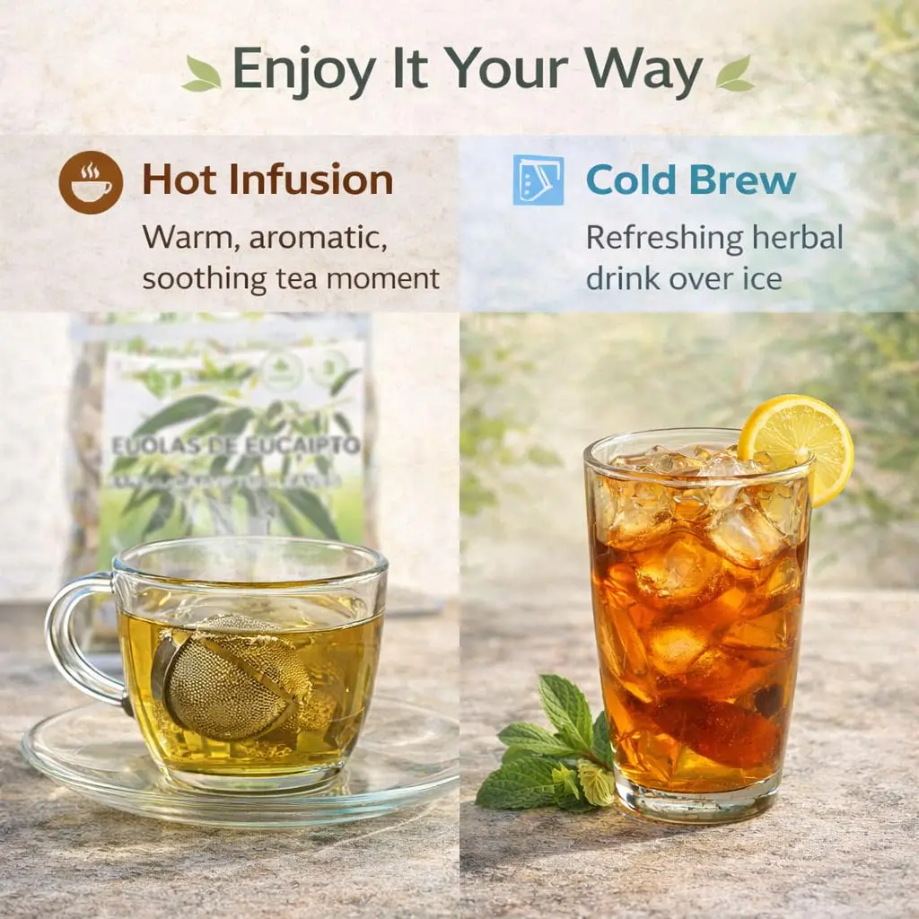 Dive into the refreshing world of Eucalyptus Leaf Tea! This 100% natural, vegan herbal tea is crafted from hand-selected, dried eucalyptus leaves. Known for its soothing properties, it offers a crisp, minty flavor that invigorates the senses. Perfect for any time of the day, it's caffeine-free and ideal for those seeking a natural beverage.