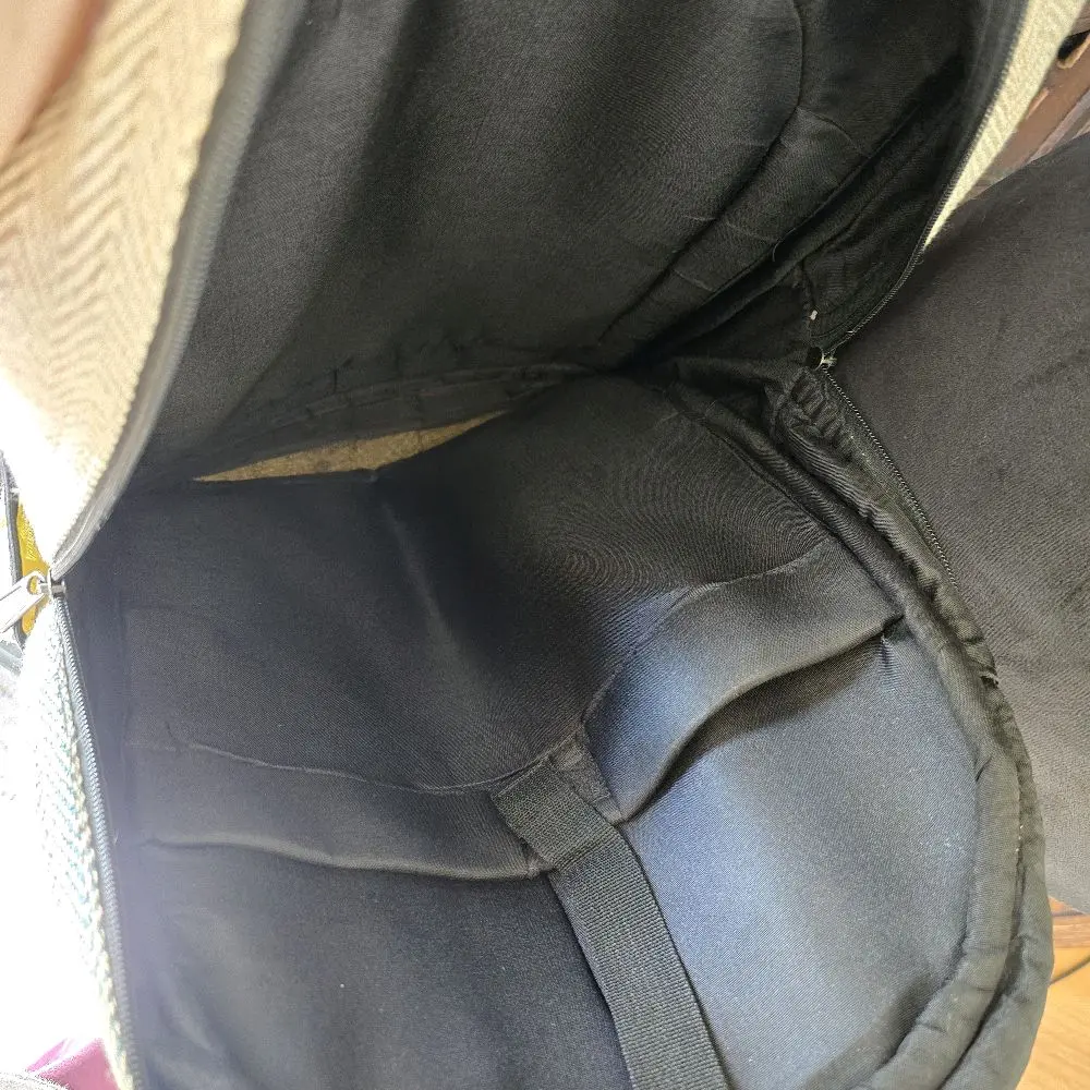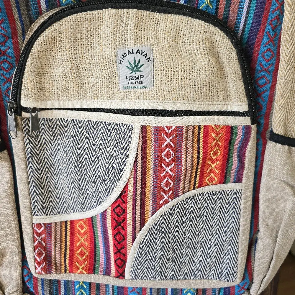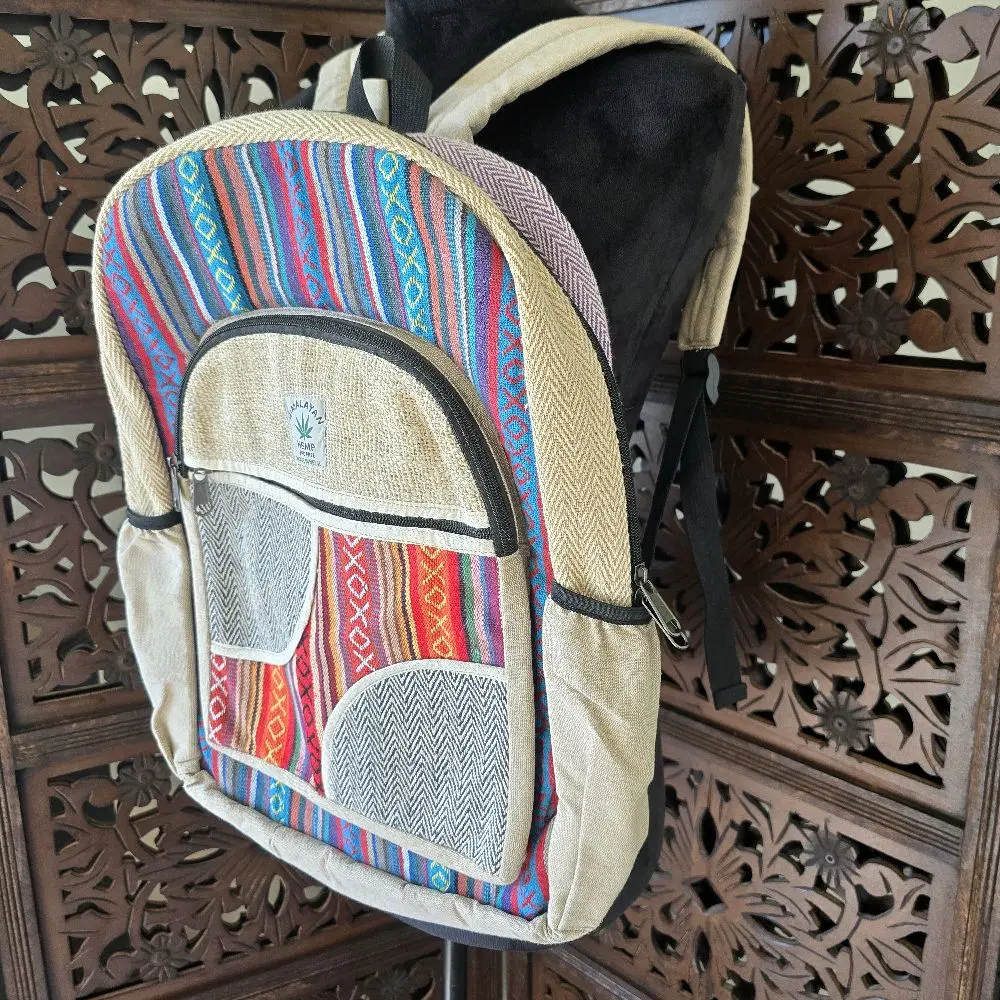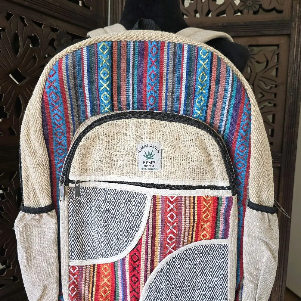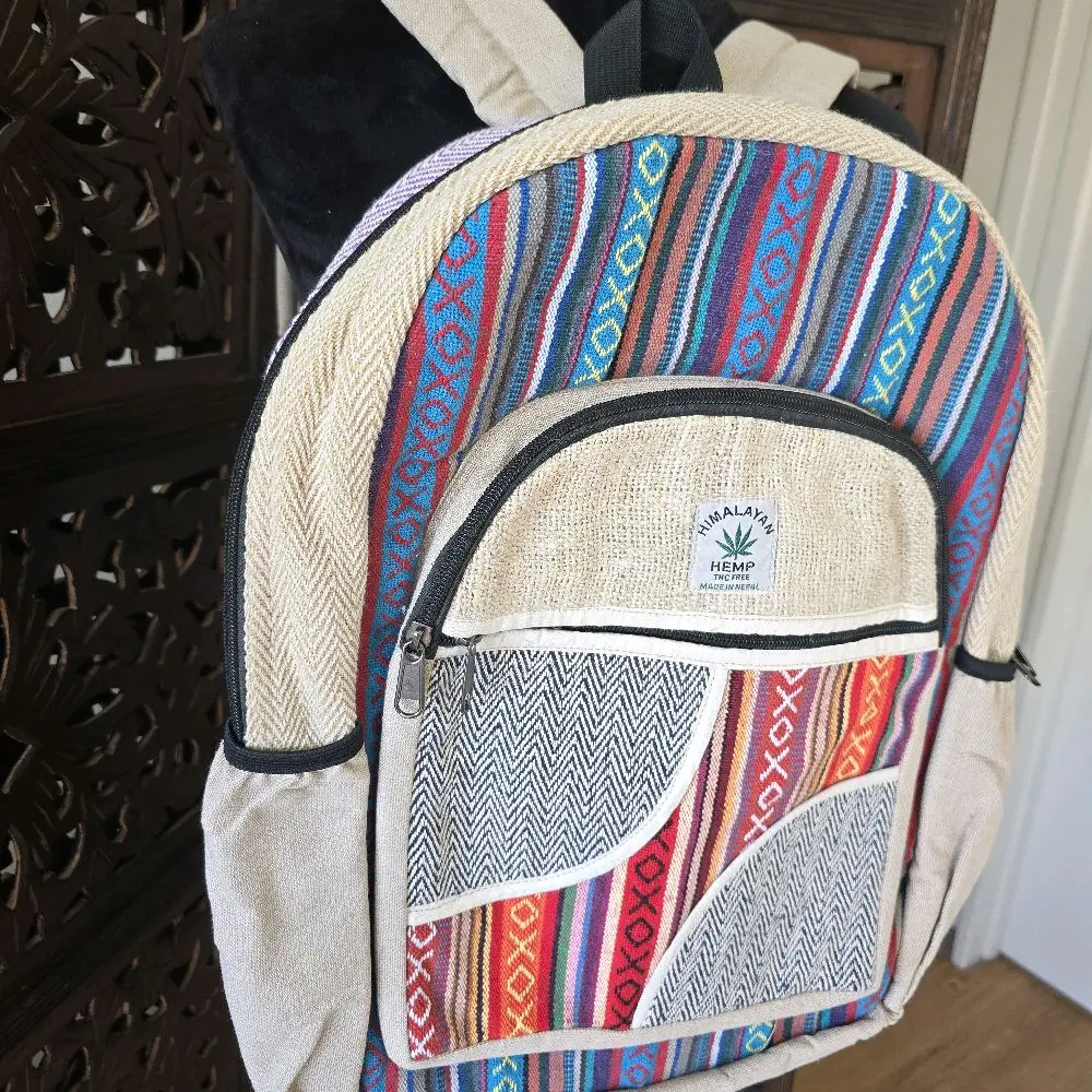 Handmade Boho Patchwork Backpack with Colorful Striped Design and Front Pockets