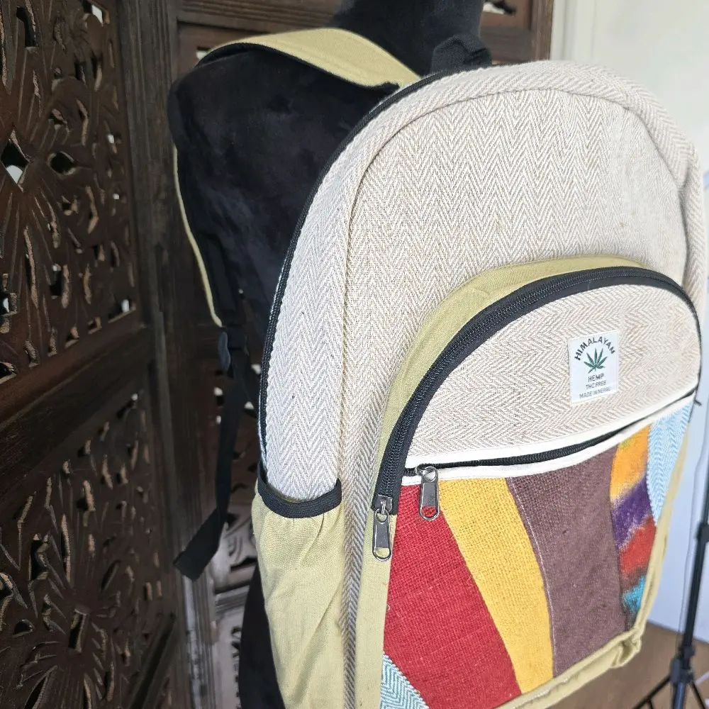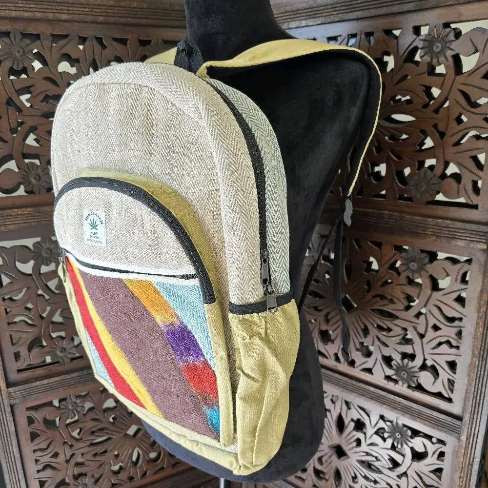 Handmade Boho Patchwork Backpack - Beige with Colorful Striped Design, Top Handle & Zippered Closure