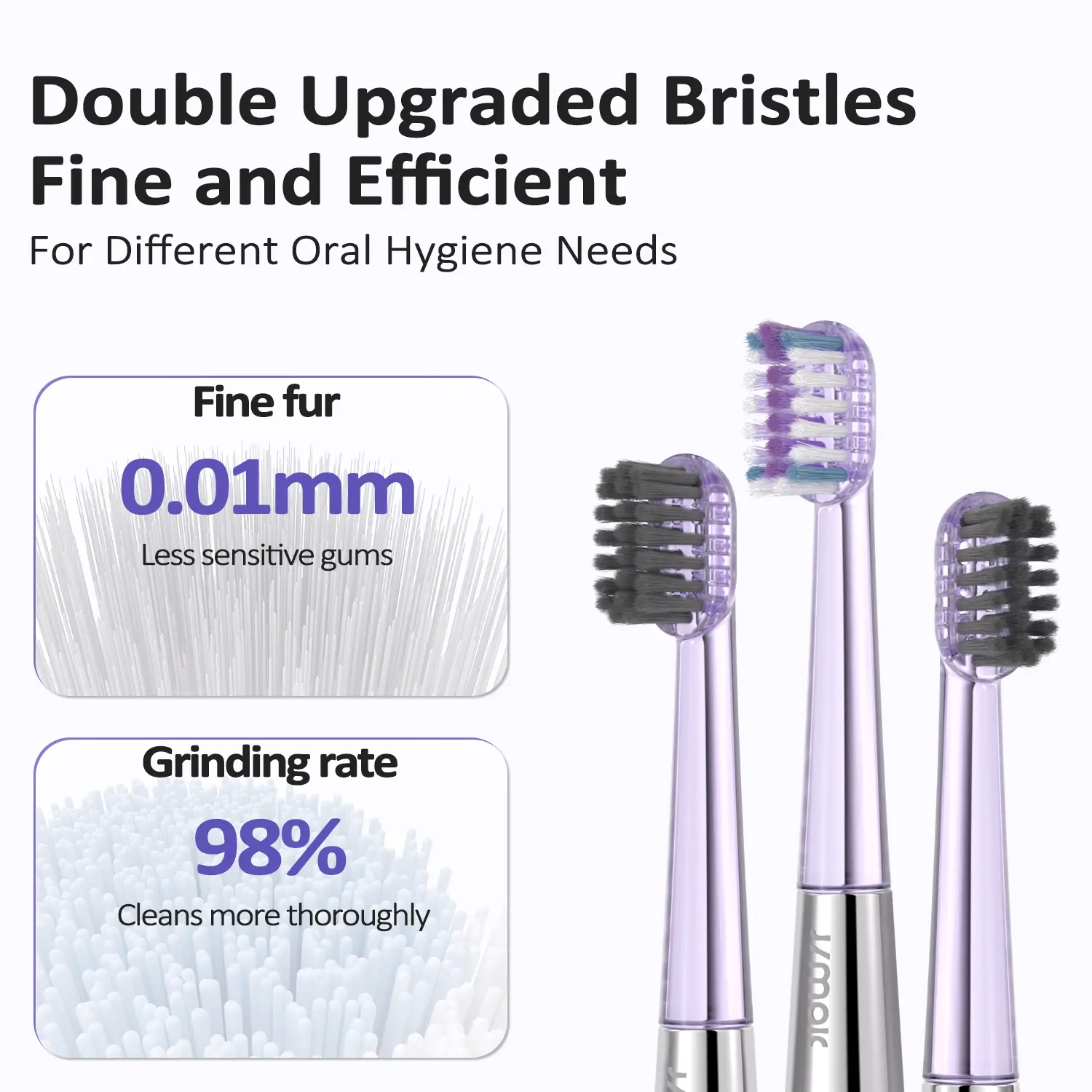·【Deep Clean & Gum Care 】The JIMOK sonic electric toothbrush features a high-speed brushless motor with 45,000 vibrations per minute, doubling cleaning efficiency. It includes 2 upgraded TORAY fine soft bamboo charcoal bristles (0.01mm tip diameter) and 1 DuPont high-elasticity rounded bristle (98% rounding rate) for a thorough clean while protecting sensitive gums.