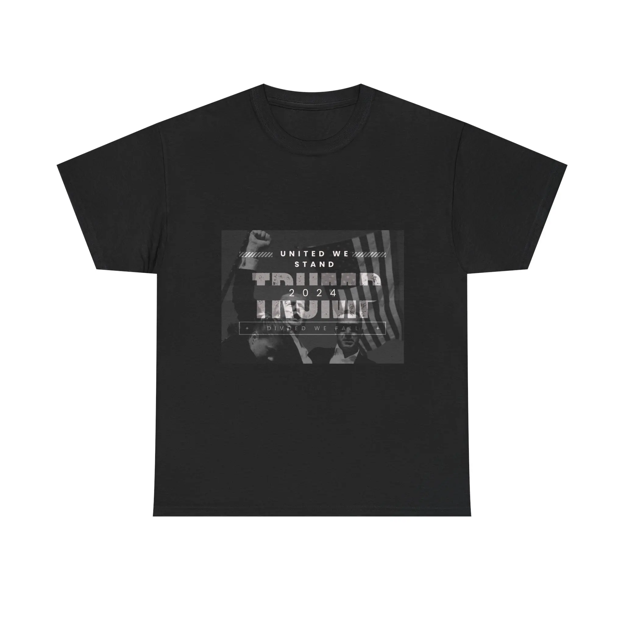 Show your support for the Trump 2024 campaign with our 'United We Stand, Divided We Fall' Black T-Shirt. This unisex tee is a must-have for any patriotic American looking to make a statement. Featuring a bold design and powerful slogan, this shirt is perfect for rallies, events, or everyday wear. Made with high-quality cotton blend material, this t-shirt offers comfort and style in one package. Whether you're a die-hard supporter or simply want to showcase your patriotism, this Trump 2024 t-shirt is the perfect choice. Stand united and shop our 'United We Stand, Divided We Fall' Black T-Shirt today to make a bold statement and support a stronger America.