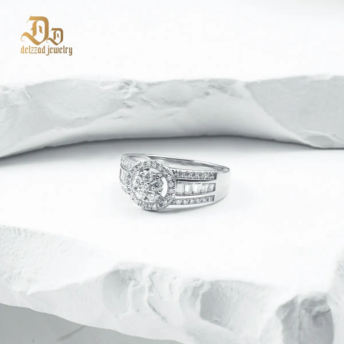 ·A dazzling halo design of synthetic moissanite stones surrounding the central stone, embodying the luxurious and bold hip-hop glamour.
