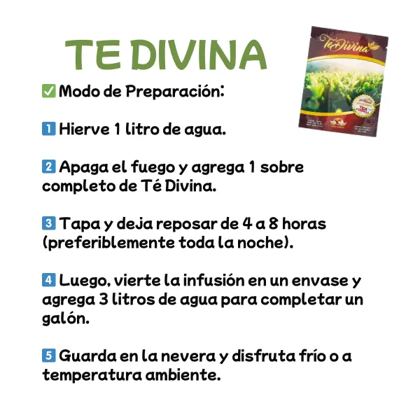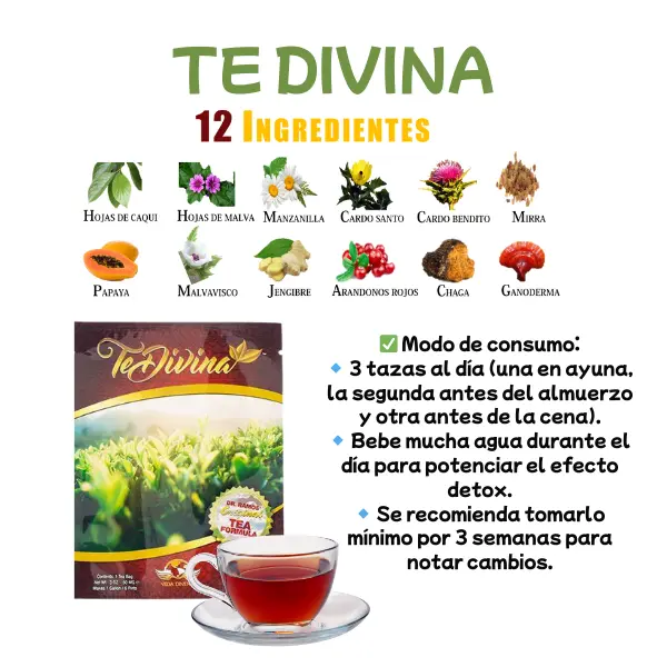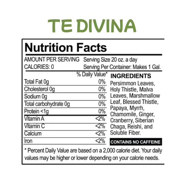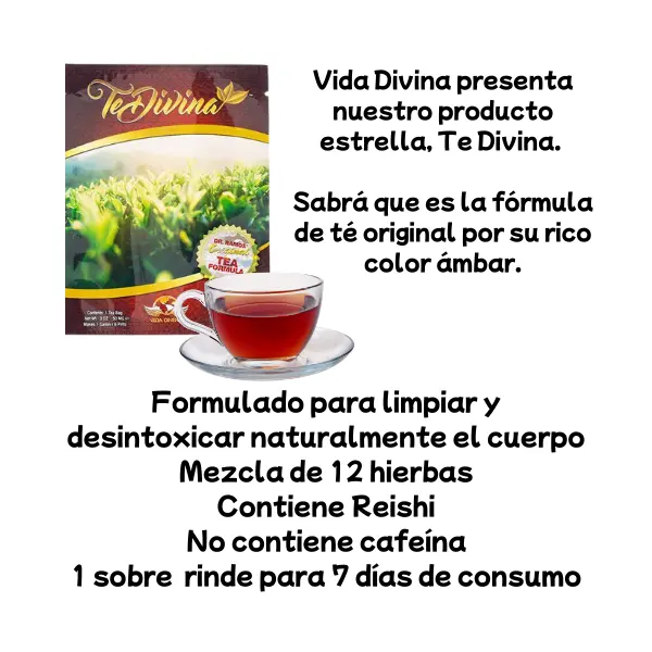 TeDivina Vida Divina presents our flagship product, TeDivina. You'll know it's the original tea formula by its rich amber color. Formulated to naturally cleanse and detoxify the body Blend of 12 herbs Contains Reishi Does not contain caffeine
