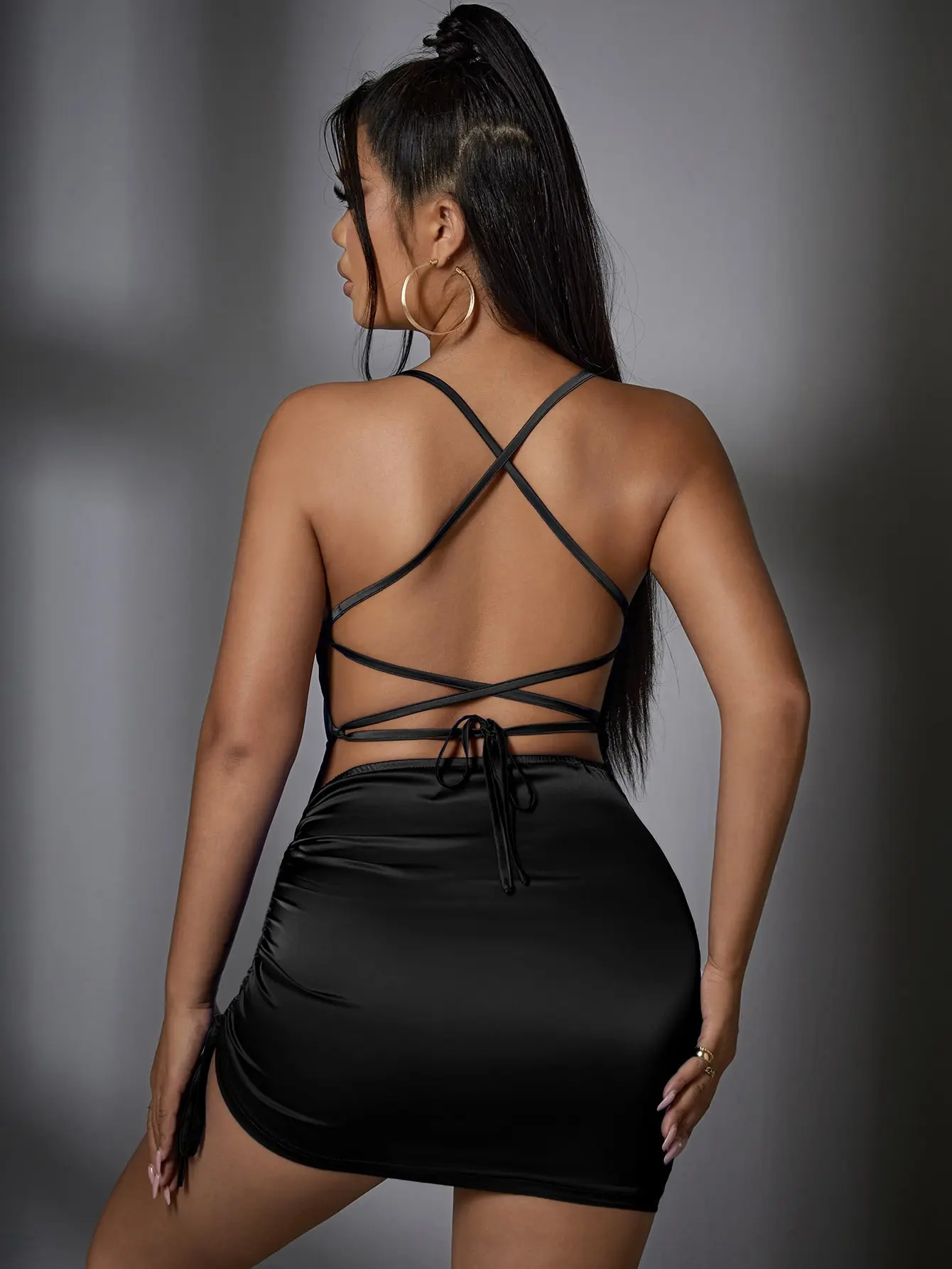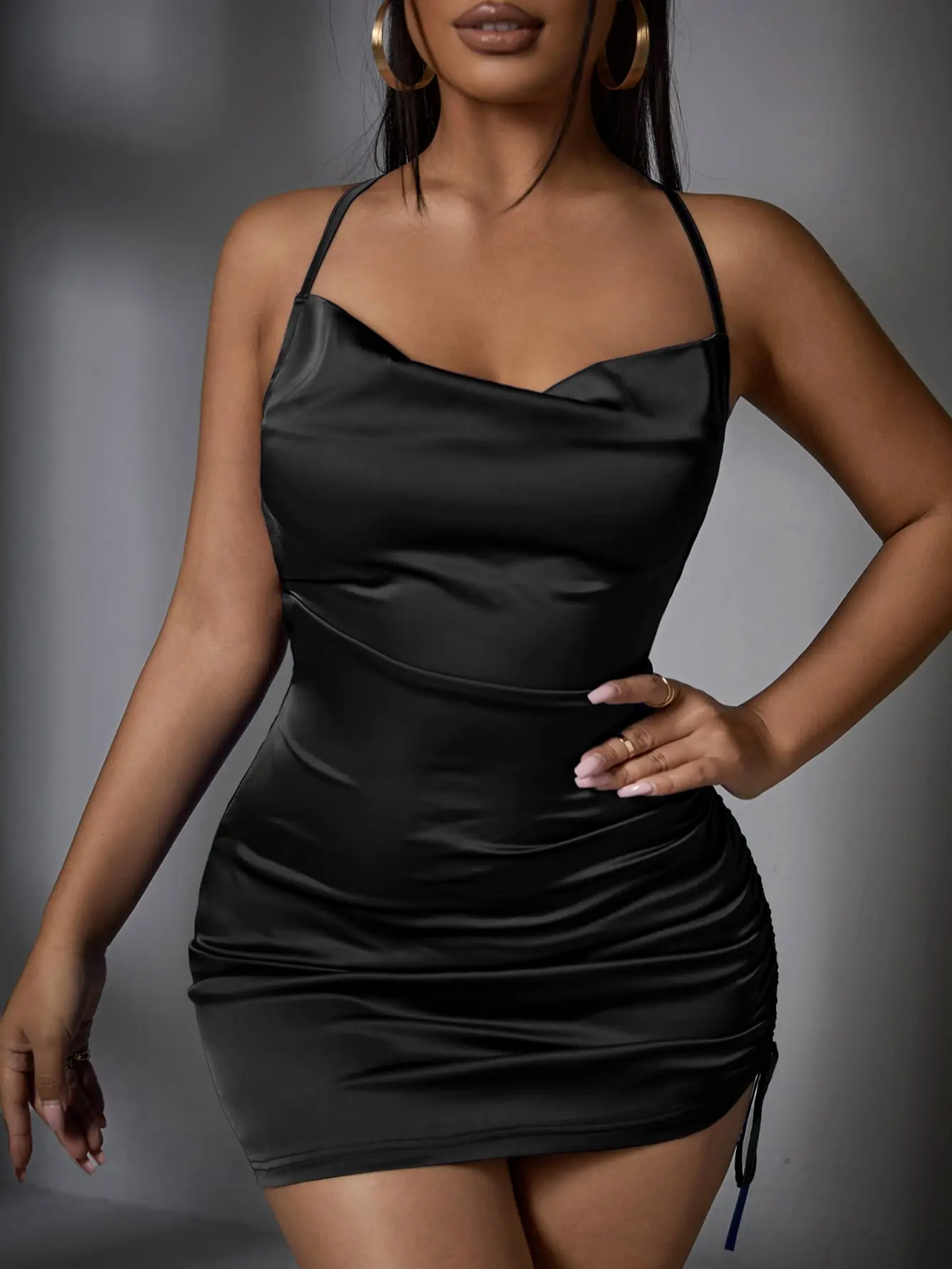 silky black dresses short Draped Collar Drawstring Side Crisscross Backless Satin Cami Dress