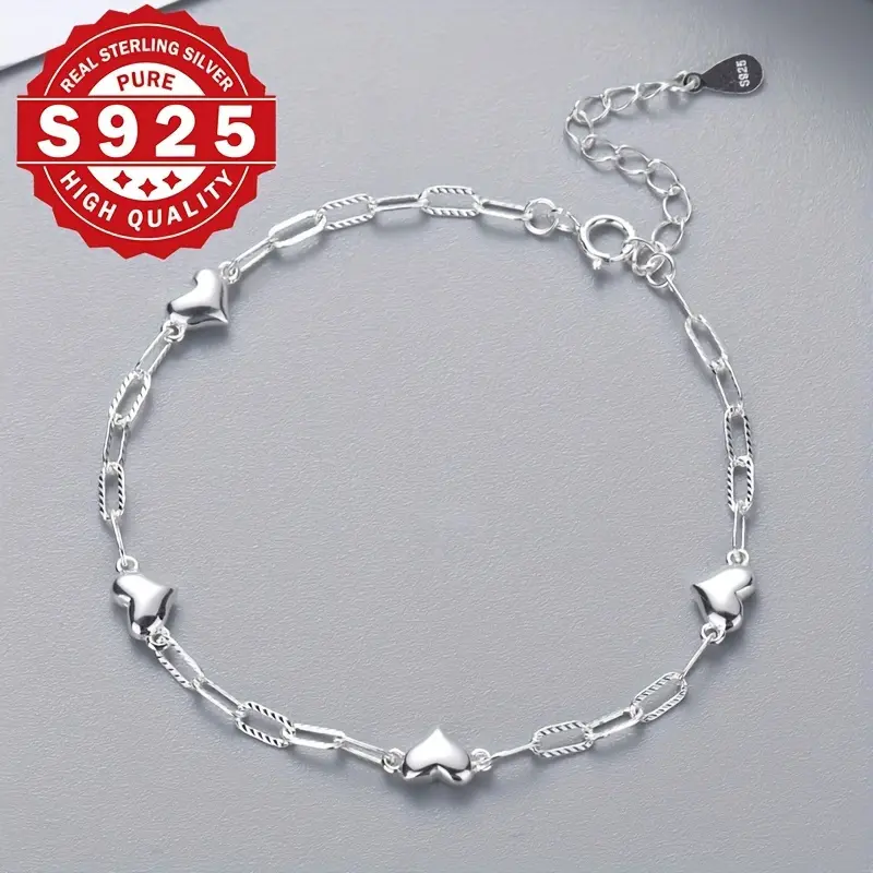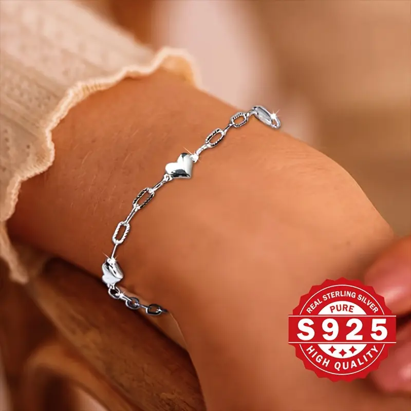 Sterling Silver 925 Bracelet For Women, 3D Heart Link Chain, Figaro Clasp, Elegant & Cute Style, Simple & Delicate Jewelry