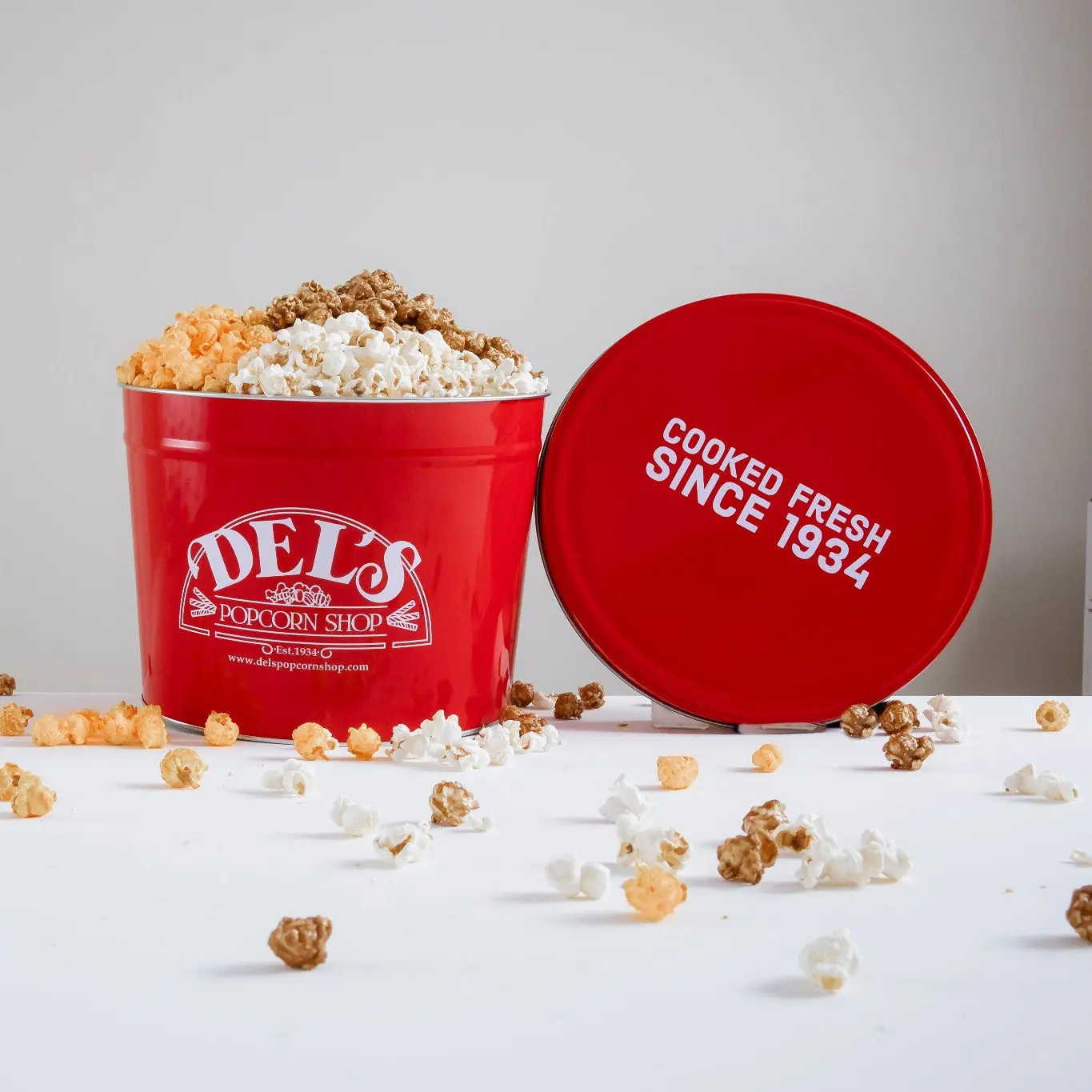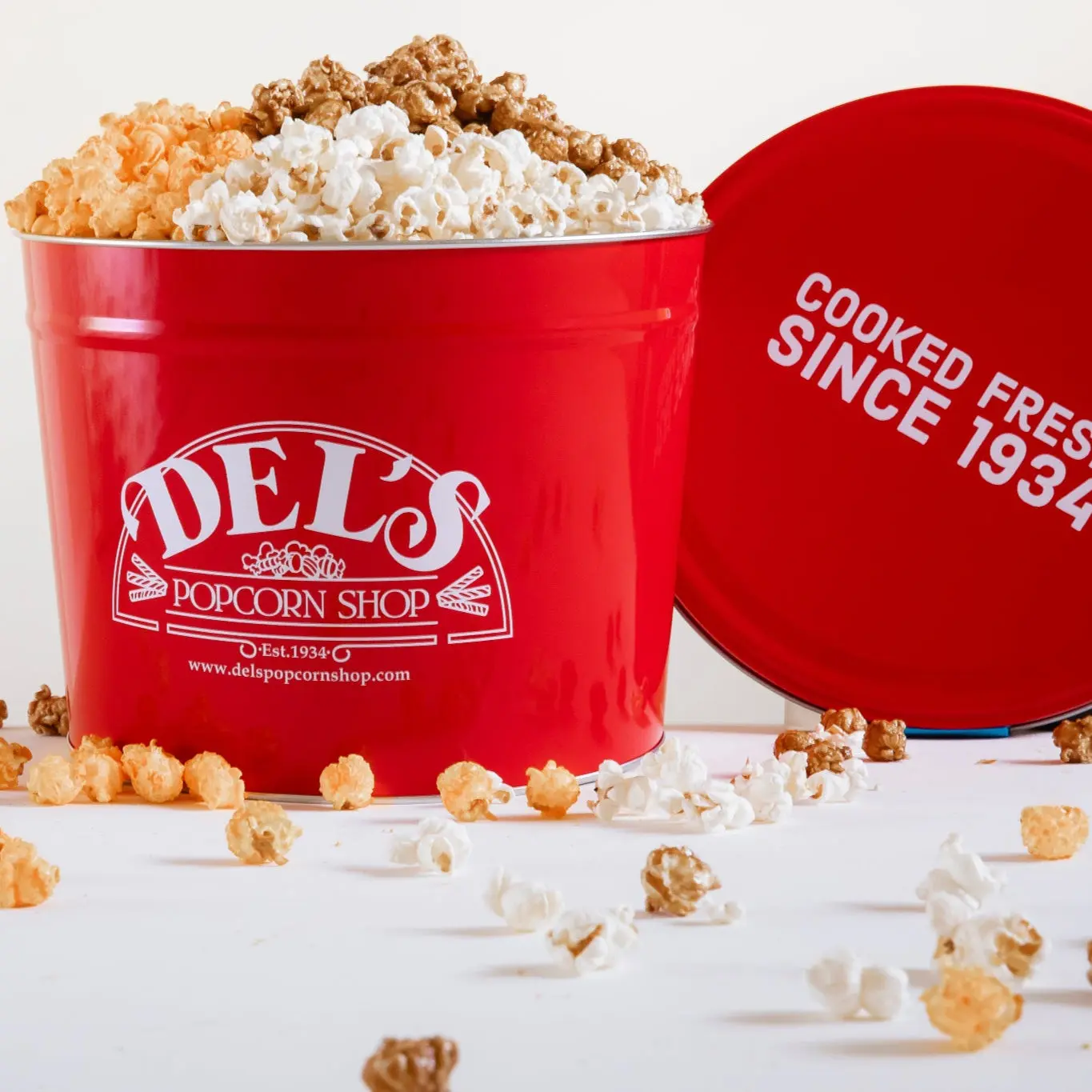 Get ready for a popping good time with Del's 2 Gallon Signature Popcorn Tin! This quirky red tin is the perfect vessel for up to 3 of your favorite flavors of gourmet popcorn from Del's Popcorn Shop. With endless flavor combinations and a playful design, this tin is a must-have for any popcorn lover.