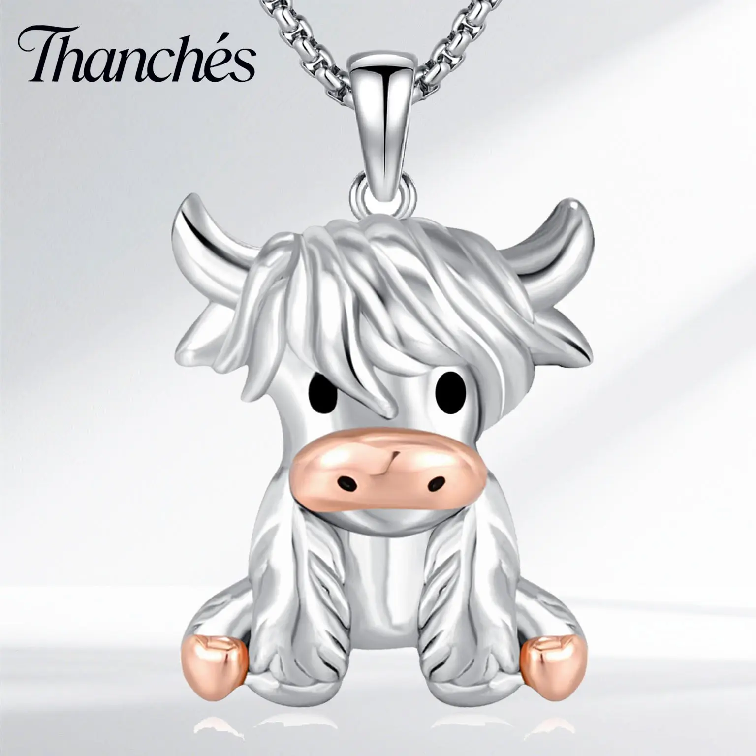 5. Thanches 925 Sterling Silver Highland Cow Pendant Necklace Cute Scottish Animal Jewelry Gift for Mom Girls Fashion Ideal Accessories Birthday For Daily Party Clothing Decor