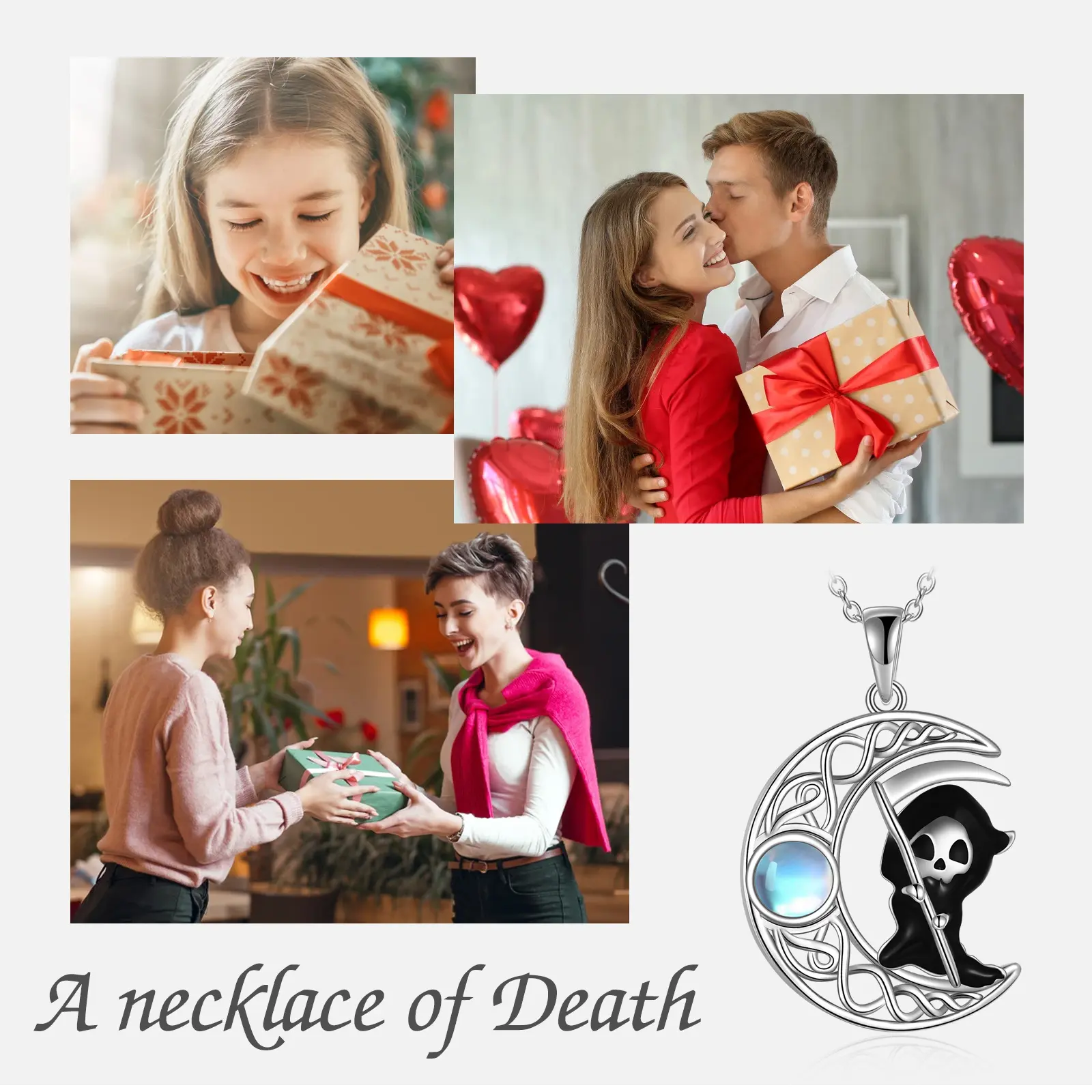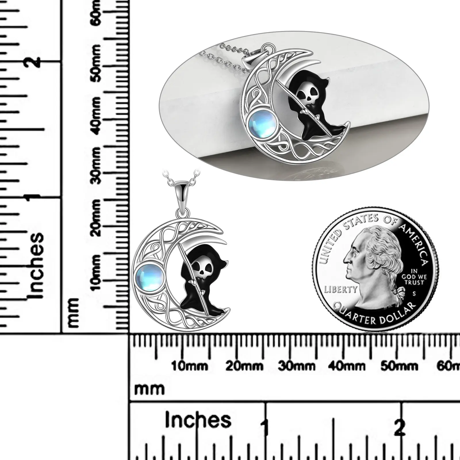 Design: The moon often represents the waxing and waning of the moon, the passage of time, mystery and feminine power. The Grim Reaper is a lovely image, expressing that death is not something to be feared, but rather a gentle and part of the cycle. Celtic knots symbolize eternity, the cycle of life and connection.