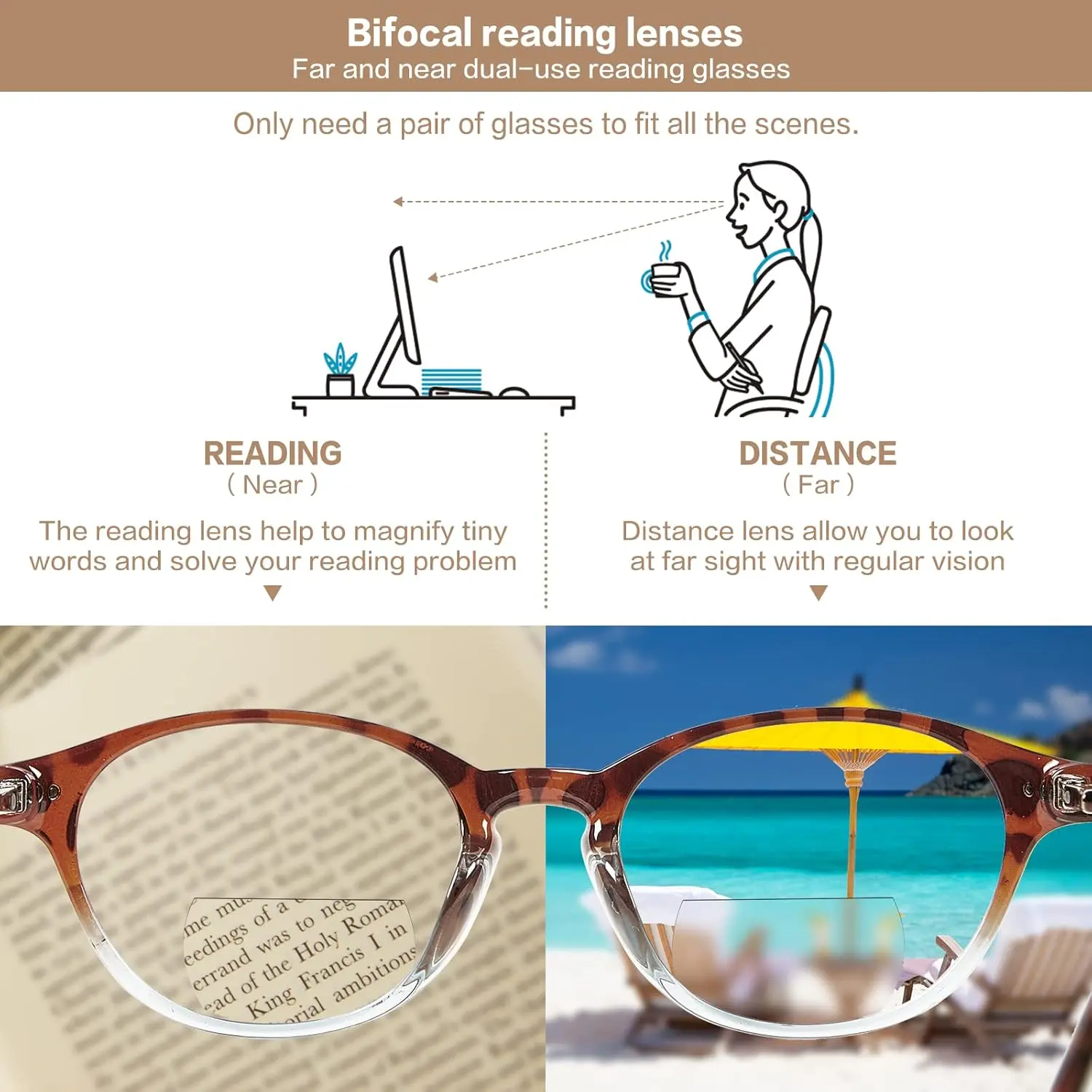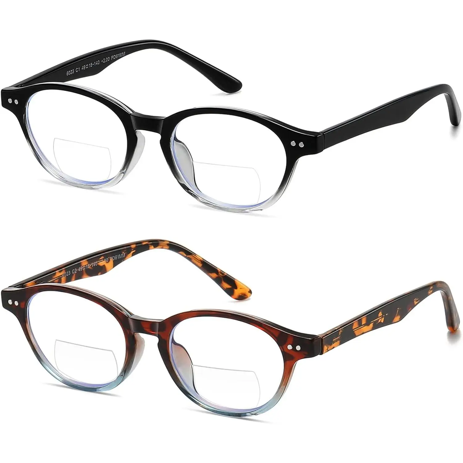 Bifocal Reading Glasses Women Blue Light Computer Progressive Readers Fashion Round Nerd Retro Clear Top Designer Stylish Cute Ladies Oval No Line Eyewear Black Leopard 2 pack LK6023 +300