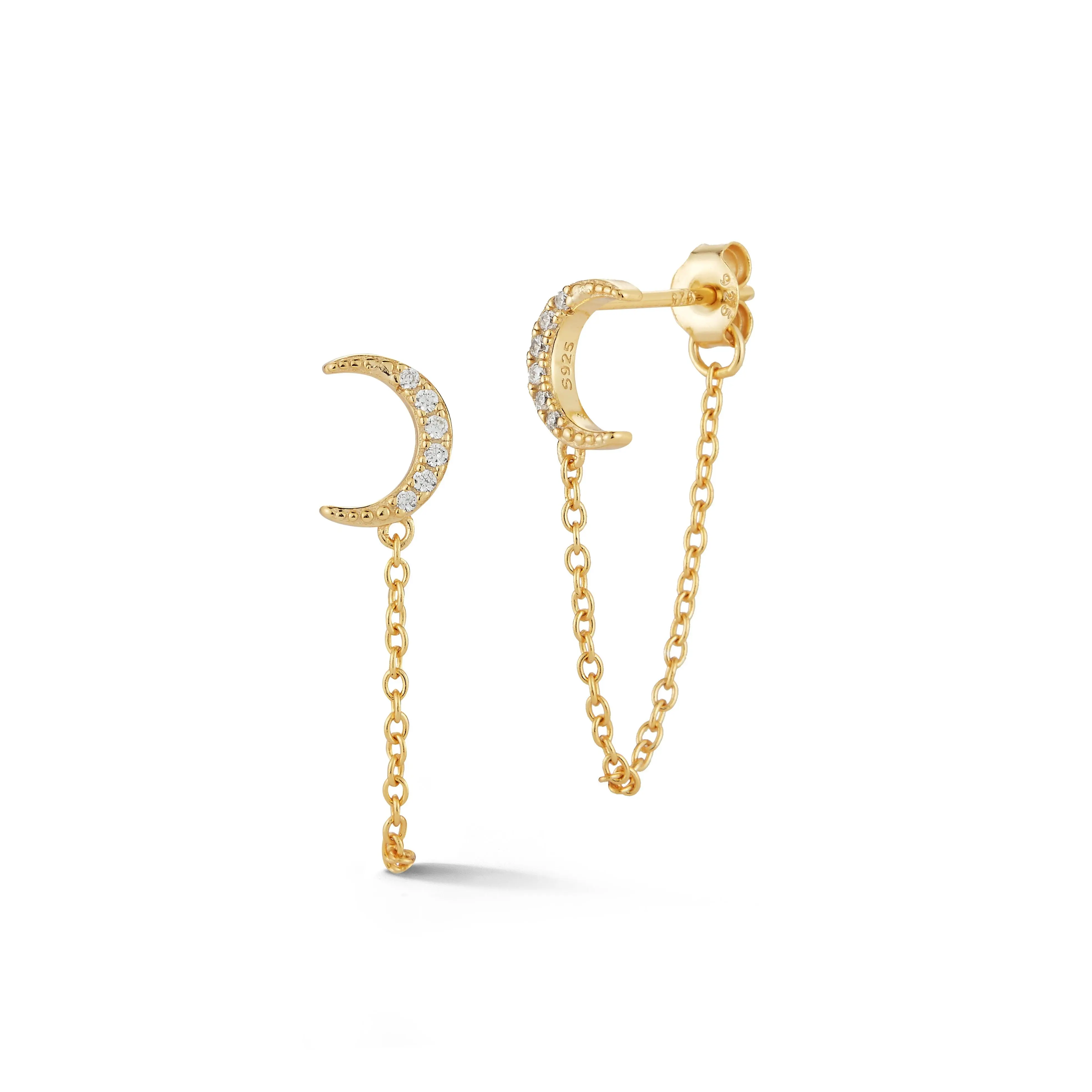 Add just a tiny bit of sparkle with these dainty and trendy Moon Earrings. These beauties feature a tiny moon encrusted with CZ stones, and a dainty cable chain that hangs from the front of the ear lobe to the back. Perfectly paired with some mini huggies for the perfect stacked ear.