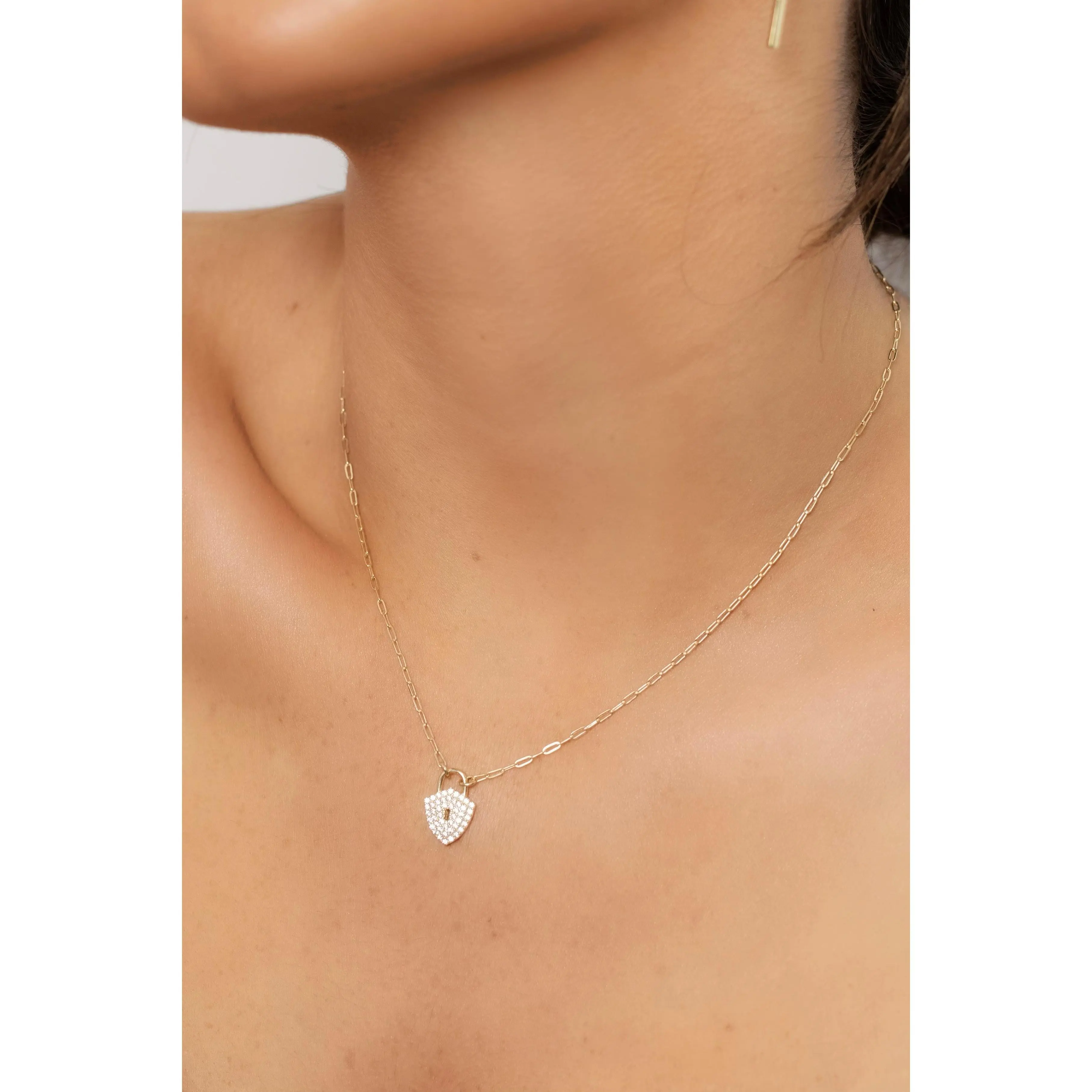 Rock an eye catching look in Sphera Milano Jewelry's Padlock Necklace, featuring a stunning lock pendant that is embellished in dazzling CZ stones and hangs from a high polished paperclip chain. Finished off with a super high polish to keep you it from tarnishing and to keep you shining. This gorgeous piece is perfectly paired with everything from a relaxed tee to a white crisp blouse. We absolutely love this necklace and we know you will too!