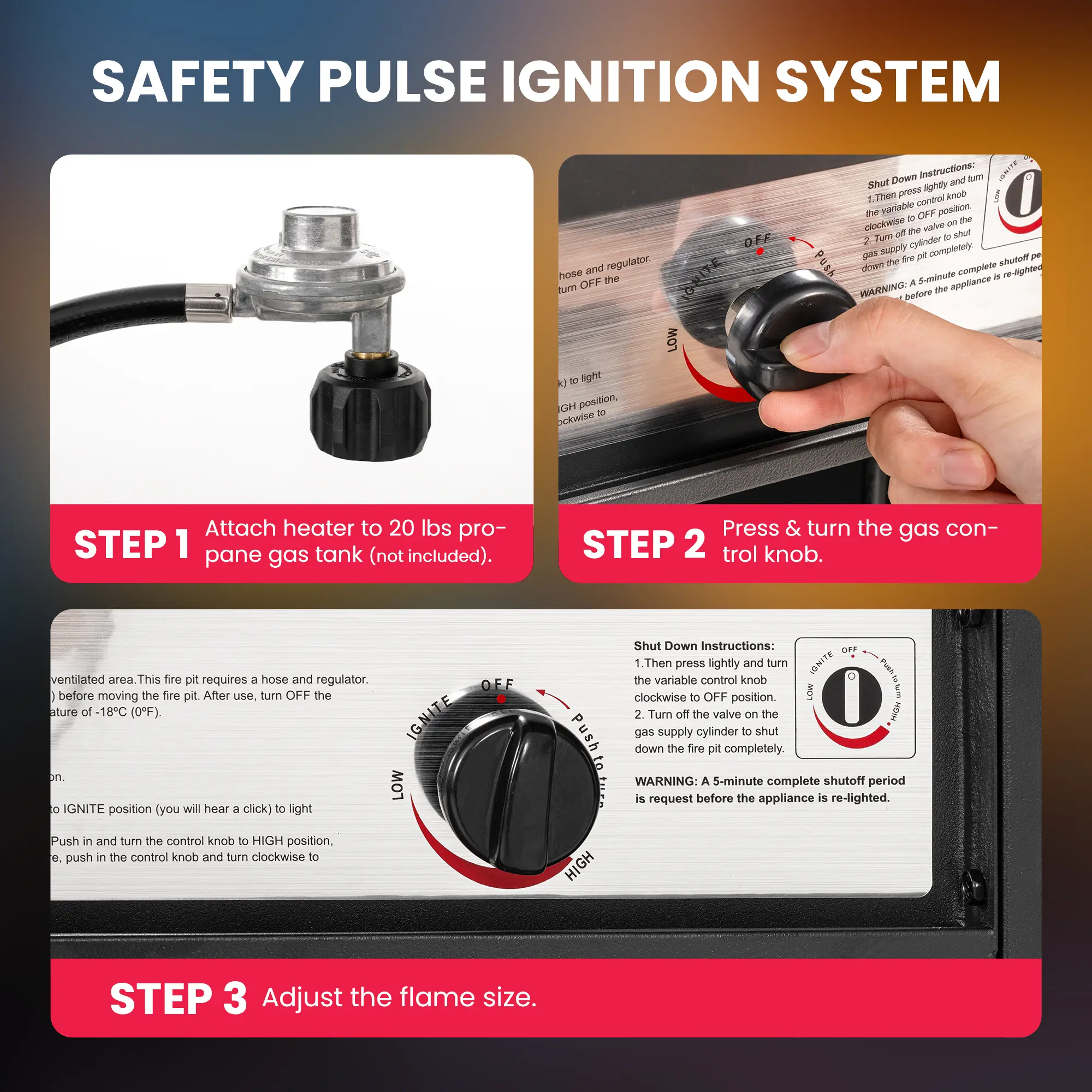 ·【Safety Pulse Ignition System】 Step 1:Seamlessly attach our patio heater to a 20 lbs propane gas cylinder (not included). Step 2: Press and turn the gas control knob, then press the ignition button. Step 3: Adjust the flame size to your preferred temperature. Additionally, the patio heater automatically shuts off when tilted or tipped over. The flame-out protection provides you with an extra layer of safety. Our patio heater provide the best atmosphere and the most suitable warmth for your family gathering.