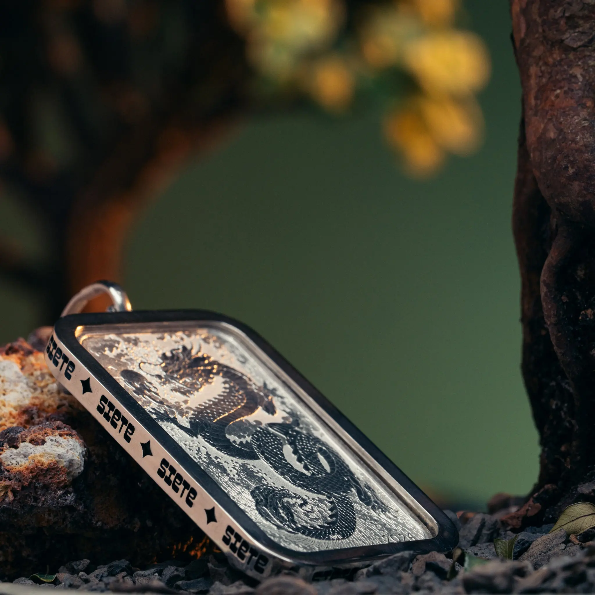 Celebrate the timeless artistry of the 2024 Perth Mint Dragon Coin with this .925 sterling silver pendant, designed to showcase its collectible value and captivating design. Featuring a rectangular AU$1 coin with a striking dragon motif, this pendant is set in a custom bezel engraved with Siete.