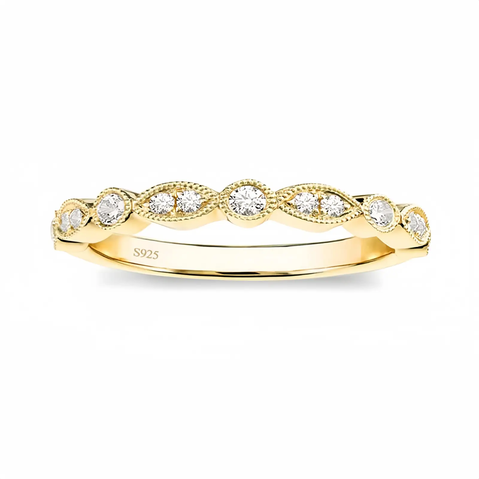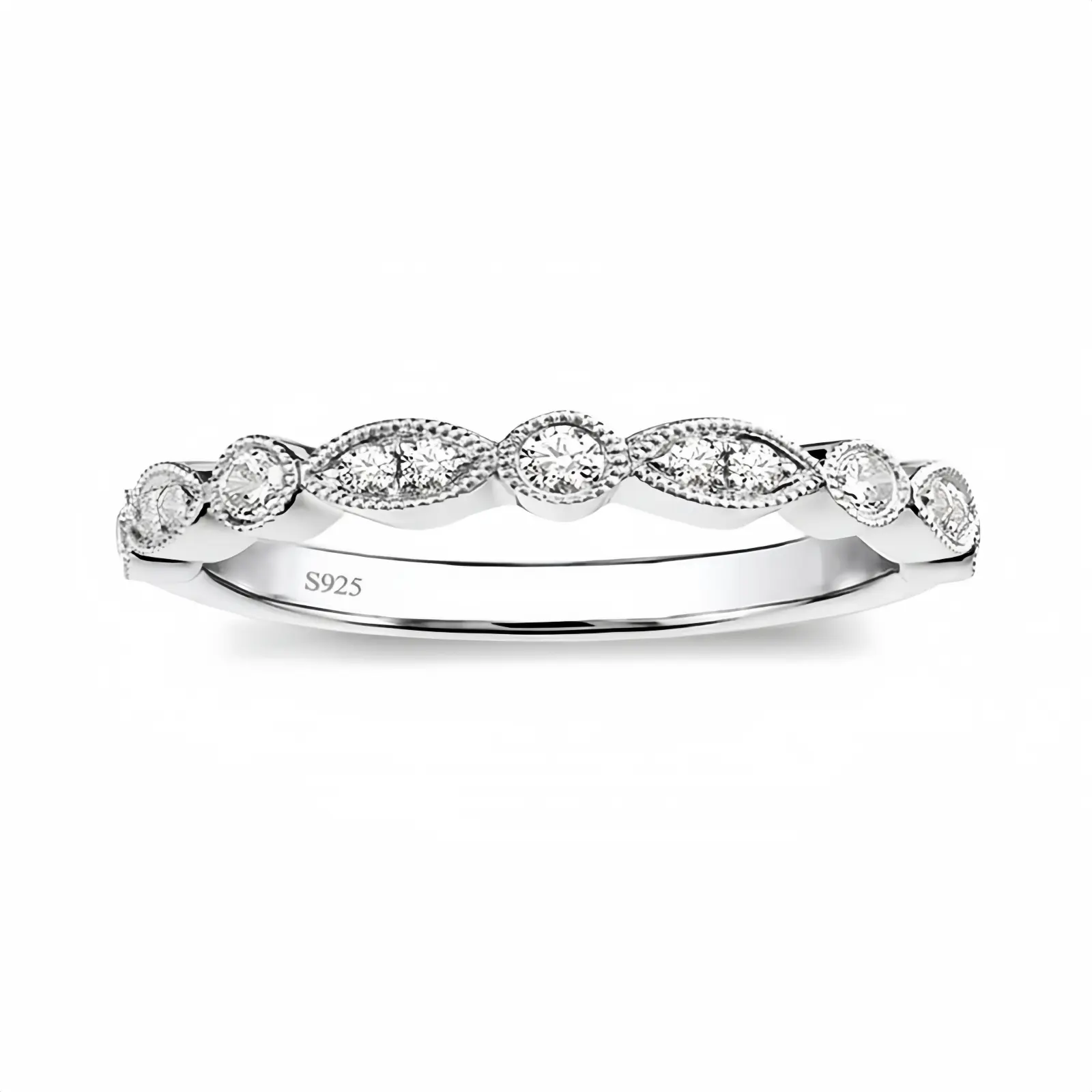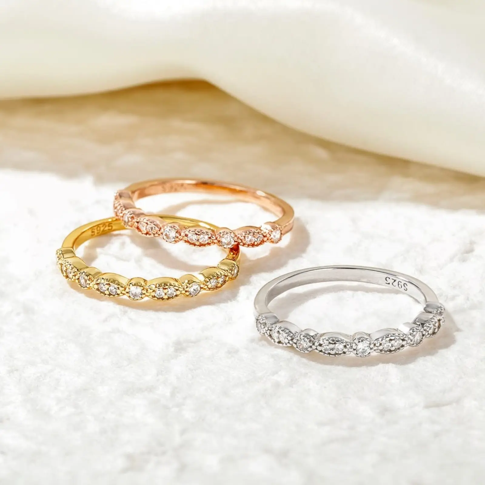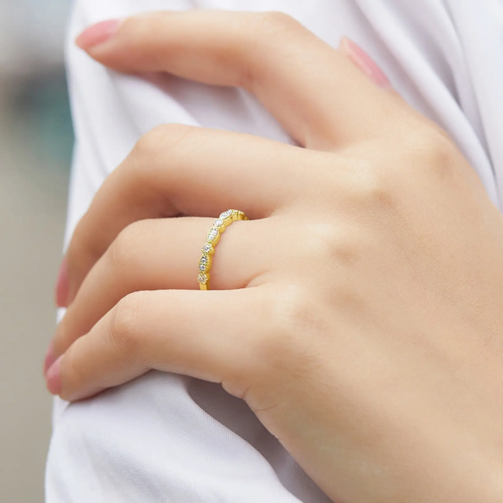 ♥ Stylish ♥ Bezel-set cz stones encircle the finger in this glamorous and whimsical band. Milgrain detailing adds a delicate and lively glimmer. A wonderful choice as a wedding ring band, it is also the perfect band to stack or wear on its own