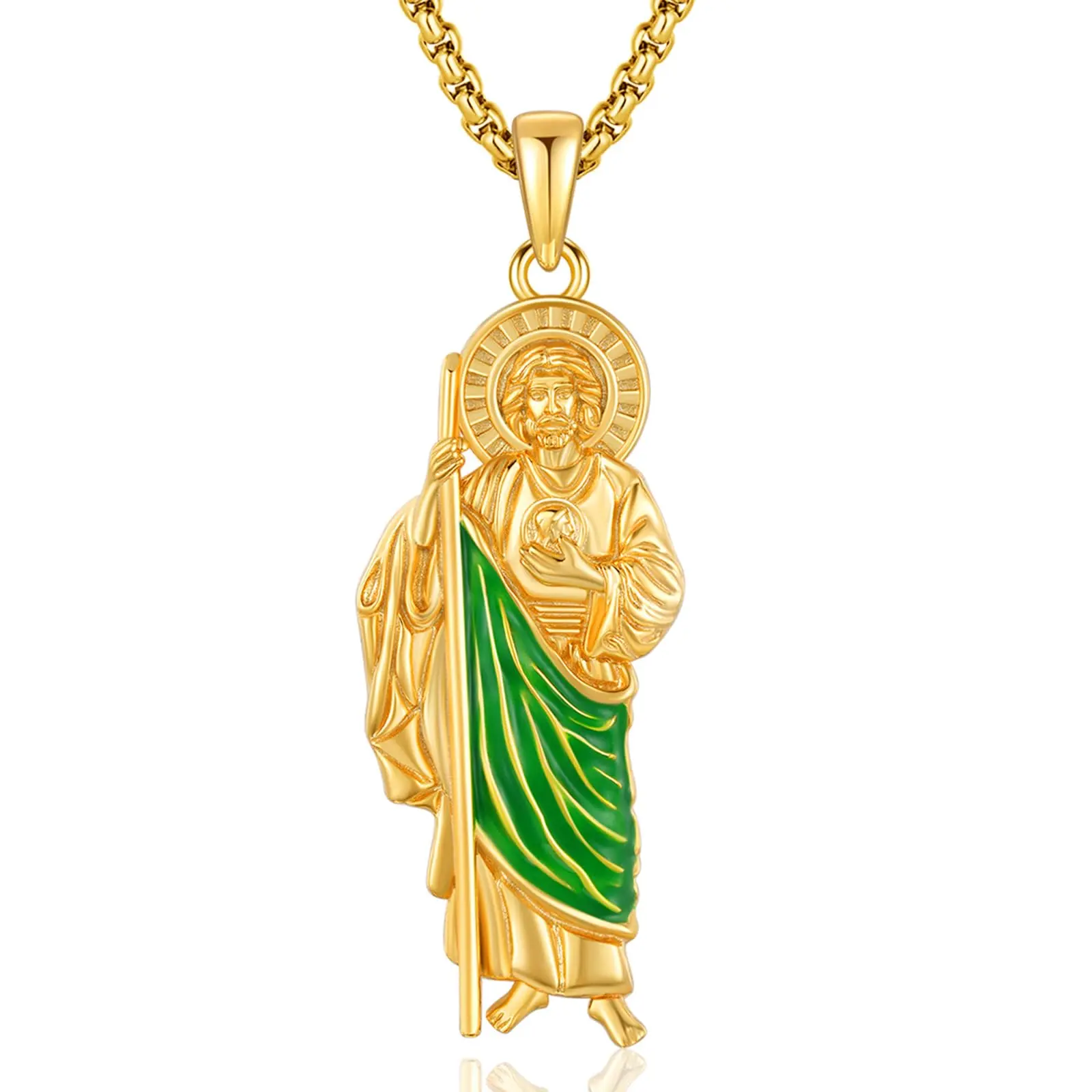 San Judas Necklace jewelry is crafted of 925 sterling silver & gold plated. The chain is made of stainless steel. Lead-free, nickel-free and cadmium-free and skin-friendly. Hand crafted, platinum plating process extends the life and keeps it shiny for a long time.