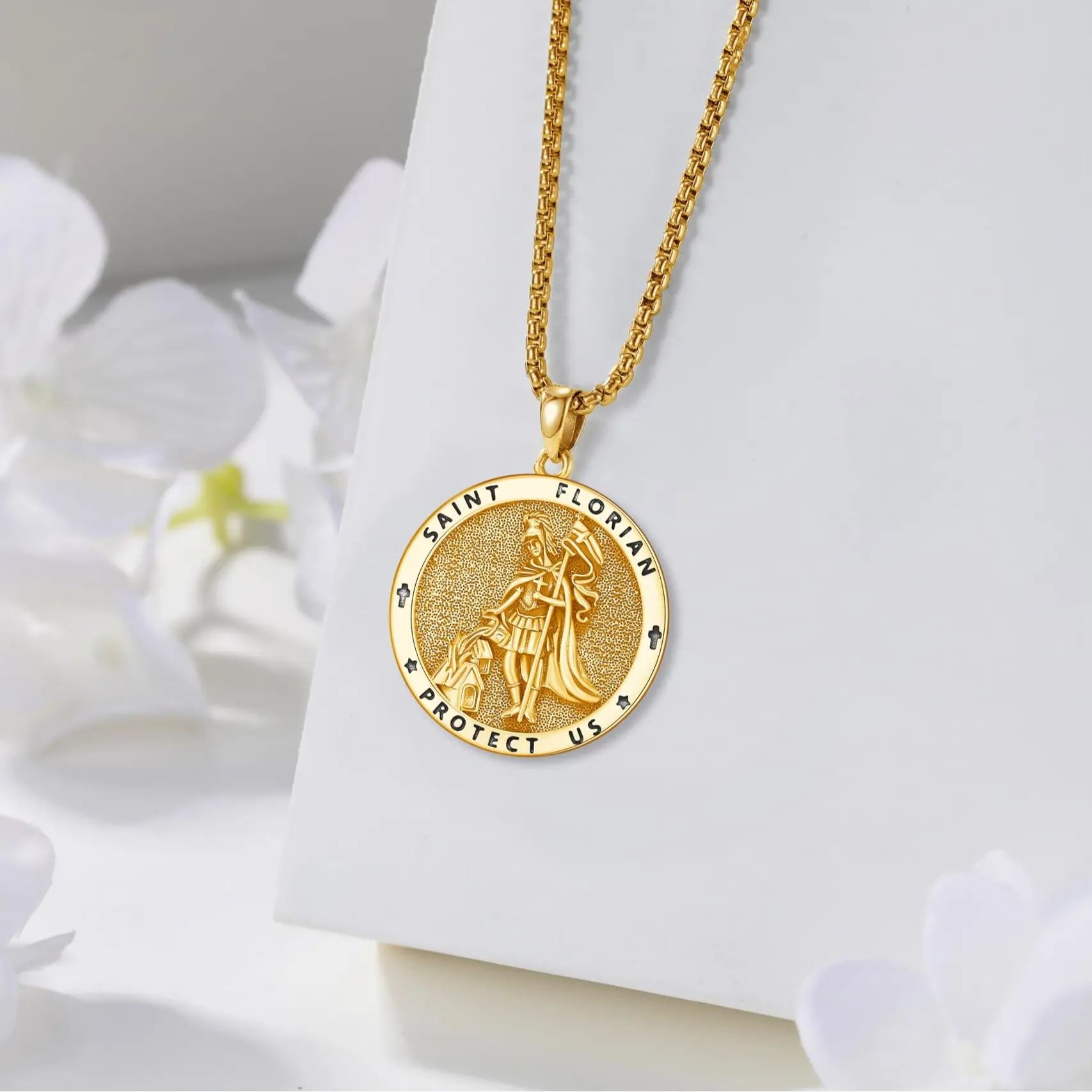 Engraved ‘SAINT FLORIAN PROTECT US’, the St Florian necklace is a powerful symbol of protection. As the patron saint of firefighters, it offers strength against fire, flood, lightning and purgatory. Wear it for safety and courage.
