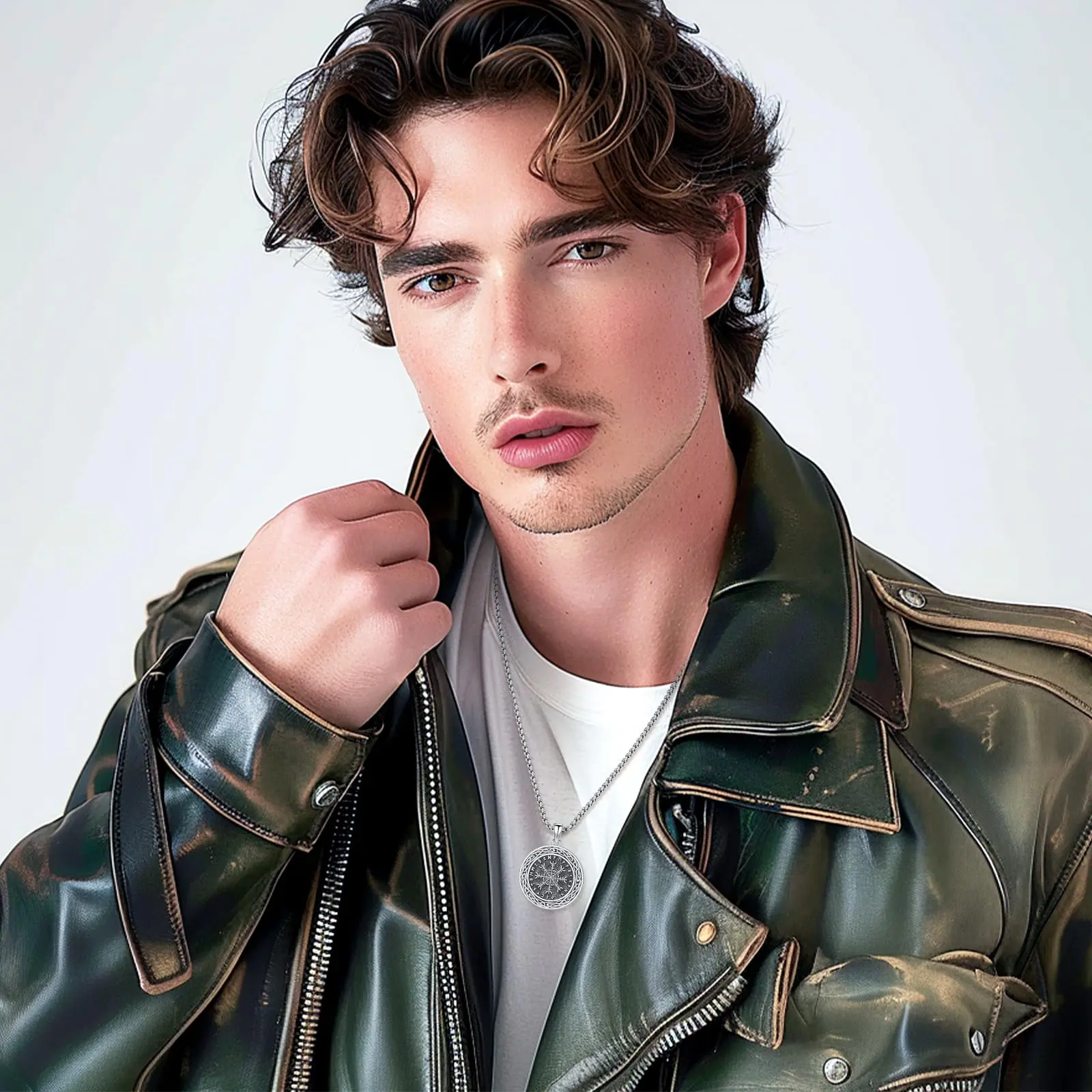 This necklace features a Viking-inspired design with a central Vegvísir (compass) symbol, surrounded by runic inscriptions. The intricate knotwork around the edges adds a Celtic touch, enhancing its ancient and mystical aesthetic. Crafted from metal, it exudes a strong, symbolic connection to Norse culture, representing guidance, protection, and strength.