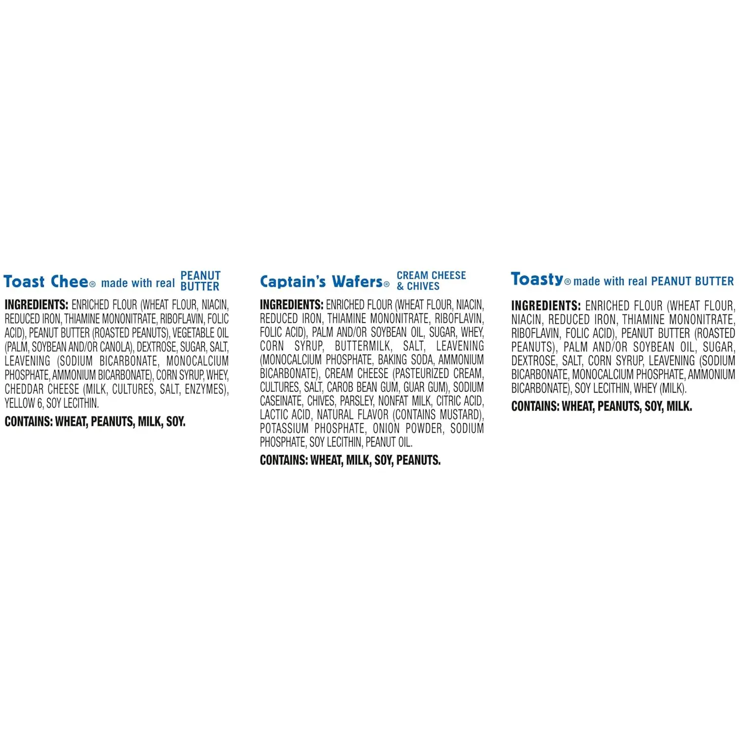 | Ingredients | Ingredients: Enriched Flour (Wheat Flour,Niacin,Reduced Iron,Thiamine Mononitrate,Riboflavin,Folic Acid),Peanut Butter (Roasted Peanuts),Vegetable Oil (Palm,Soybean And/Or Canola),Dextrose,Sugar,Salt,Leavening (Sodium Bicarbonate,Monocalcium Phosphate,Ammonium Bicarbonate),Corn Syrup,Whey,Cheddar Cheese (Milk,Cultures,Enzymes),Yellow 6,Soy Lecithin. Contains: Wheat,Peanuts Milk,Soy. Ingredients: Enriched Flour (Wheat Flour,Vegetable Oils (Soybean,Palm,And/Or Canola),Buttermilk,Ammonium Bicarbonate,Monocalcium Phosphate),Cream Cheese (Pasteurized Milk And Cream,Stabilizers (Xanthan,Carob Bean,And Guar Gum]),Sodium Caseinate,Spices (Chives,Parsley),Nonfat Milk,Natural And Artificial Flavors,Potassium Phosphate,Sodium Phosphate,Soy Lecithin,Peanut Oil. Contains: Wheat,Soy,Milk,Peanuts. Ingredients: Enriched Flour (Wheat Flour,Whey (Milk),Peanuts,Soy. |