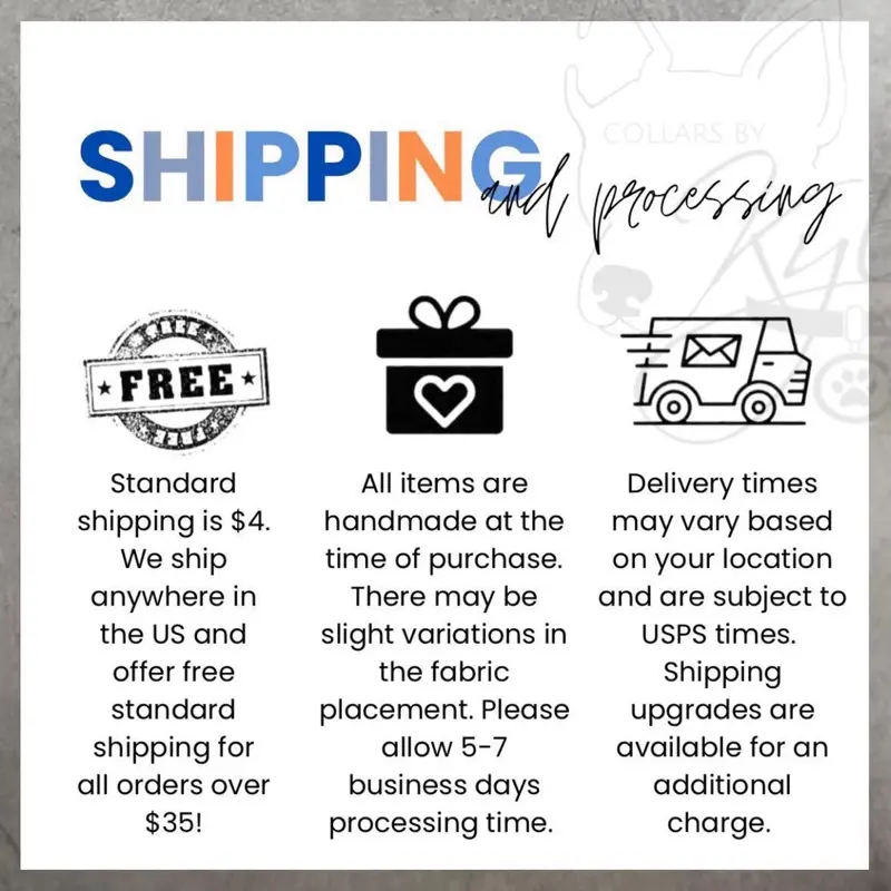 ↠↠ Why choose Collars by Kylie over any other dog collar vendor? We choose to sew our fabric over a heavy polypropylene webbing core rather than using stabilizer. I believe this is what makes our collars stronger and last longer. The benefit of heavy polypropylene webbing is that it is resistant to water, mold, mildew, stretching and UV-Rays. We choose to use the highest quality when selecting fabric and thread, and use metal buckles not only for the look, but for the durability and strength.