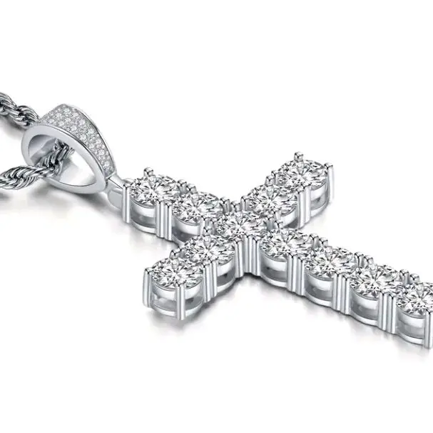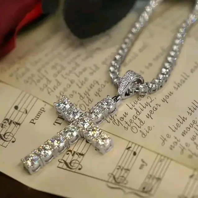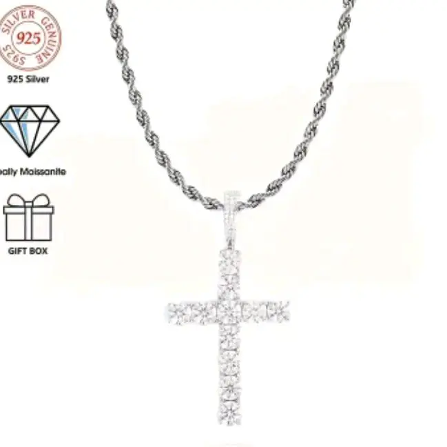 Moussanite 11K 925 Sterling Silver Men's Chain Necklace with Cross Pendant