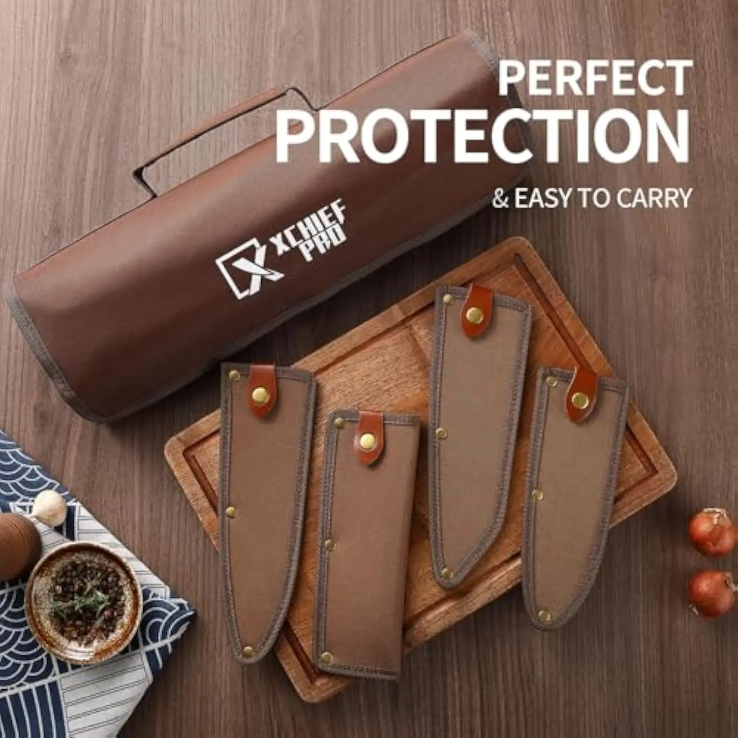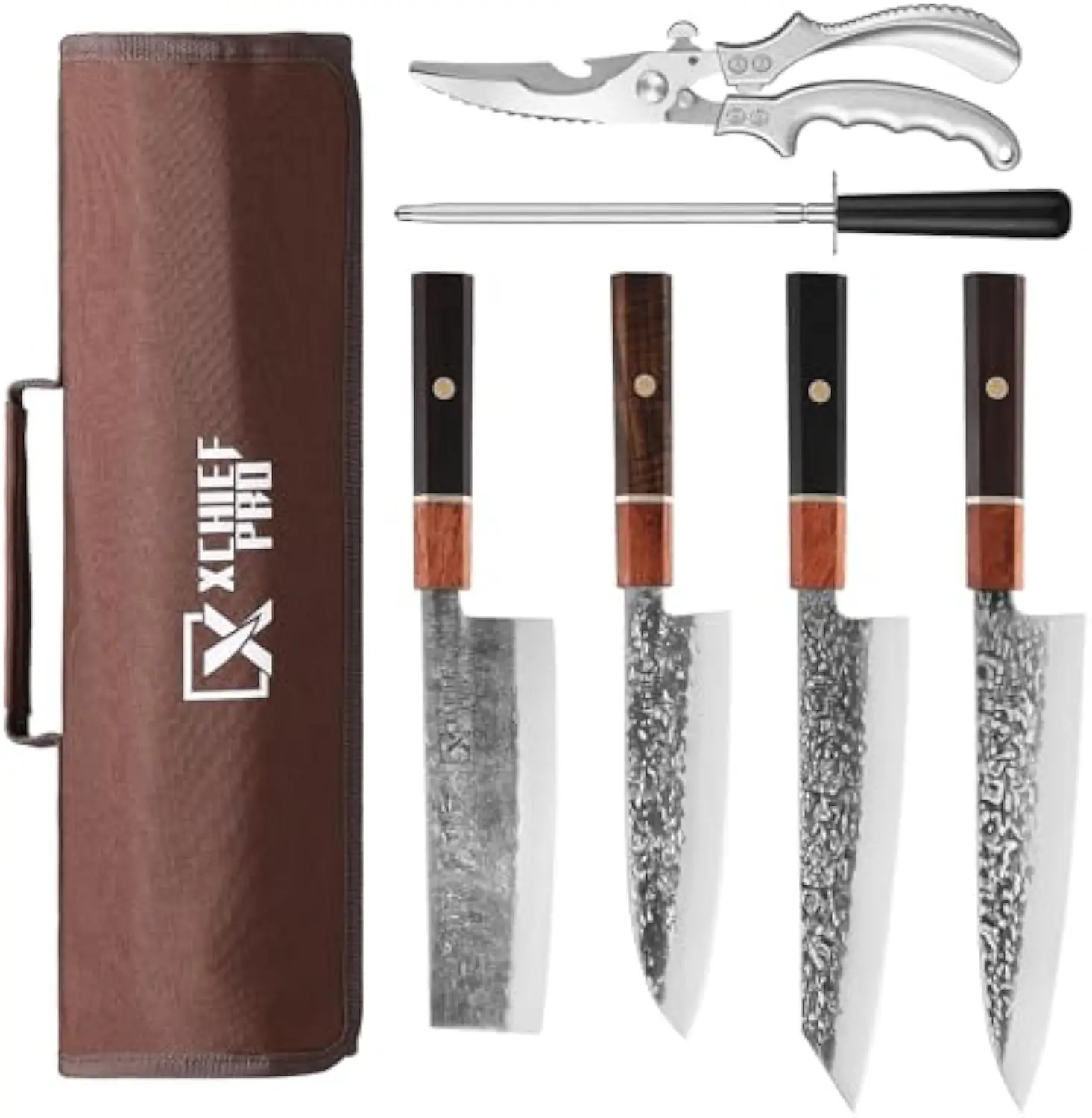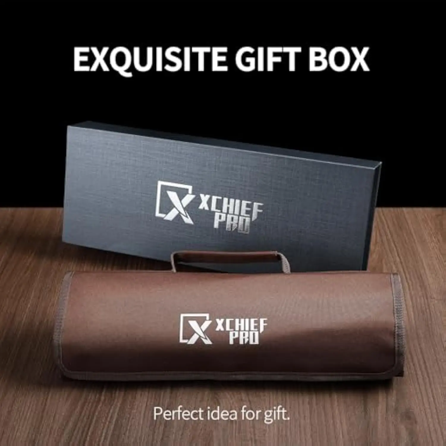 ·One Set for Most Tasks: This XCHIEF PRO Chef's Knife Set includes 4 meat and vegetable cutters( 8" Kiritsuke Knife, 8" Gyutou Knife, 7" Santoku Knife, 7" Nakiri Knife), a high quality knife storage bag, poultry shears, honing steel. Designed to handle a variety of kitchen tasks such as slicing, chopping, dicing, mincing and cutting tough vegetables, thick meats, cartilage, fish, fruit and more.