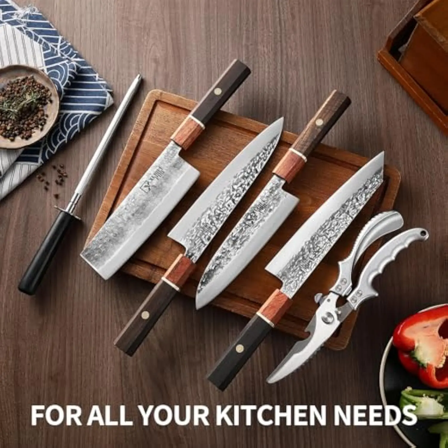 ·Premium Japanese Knives: XCHIEF PRO knives feature classic Japanese handle design for stability and comfort. The handle is made from premium wood, providing durability and slip resistance for confident handling. The blade is forged using a stonewashed and hammer finish treatment, making it tough, wear-resistant, and non-sticking. High carbon steel knives are easy to care for and maintain, with regular maintenance, these knives will stay sharp.