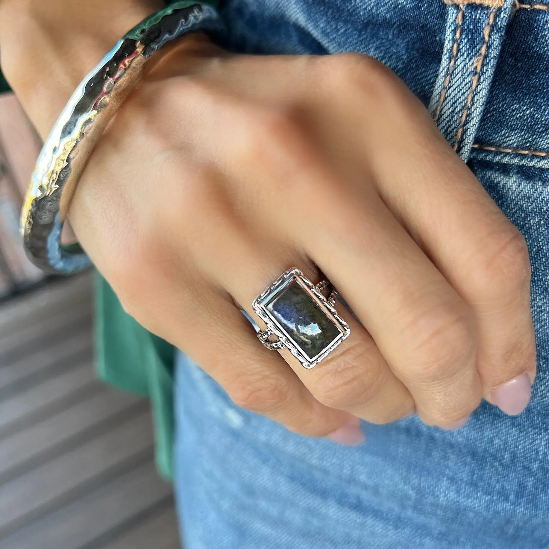 Transform any outfit into a statement with our London Fog Ring! Crafted from sterling silver with a rectangle labradorite stone, this ring adds a touch of luxury to your look. The elongated front measures about 18mm, and the split-shank band tapers to 2.4mm in the back. The natural labradorite measures about 13x8mm - over 6 carats of misty glow. Feel effortlessly chic while flaunting this unique and eye-catching accessory.