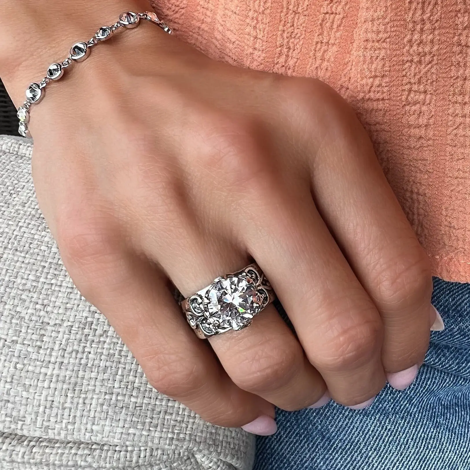 Transform into a modern-day princess with the Cinderella Ring! This sparkling beauty features 3 carats of pure glam. The center stone is prong set in a raised elegantly detailed bezel, and the ring measures about 11mm in the front and tapers to just under 6.5mm in the back. The round-faceted CZ measures 10mm, displaying 4 carats of beautiful glow! No pumpkin carriage is needed, just a little sparkle to make all your dreams come true.
