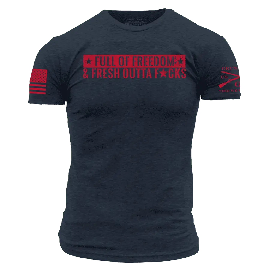 Our Supply Chief wants the room, so these have to go! We have only limited sizes and quantities available. When you're fresh out of patience for drama and nonsense, the Fresh Outta F*cks T-Shirt in Midnight Navy says it all. This tee is perfect for those days when you're over it—no explanations needed.Our Patriotic Shirts are crafted with the following details: