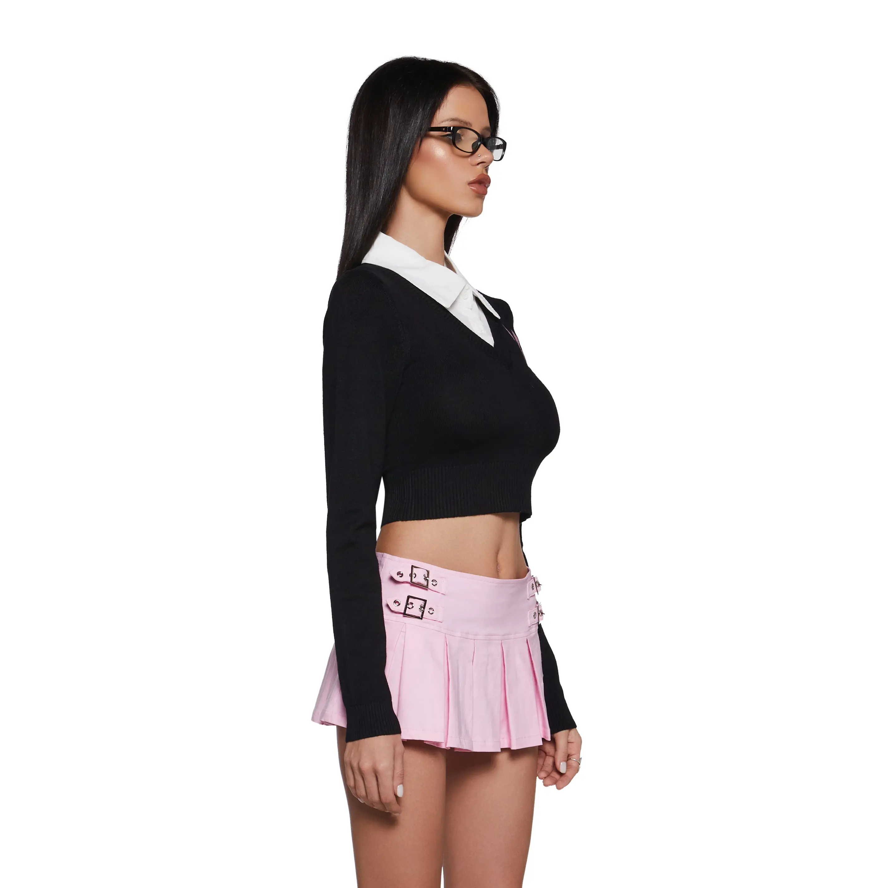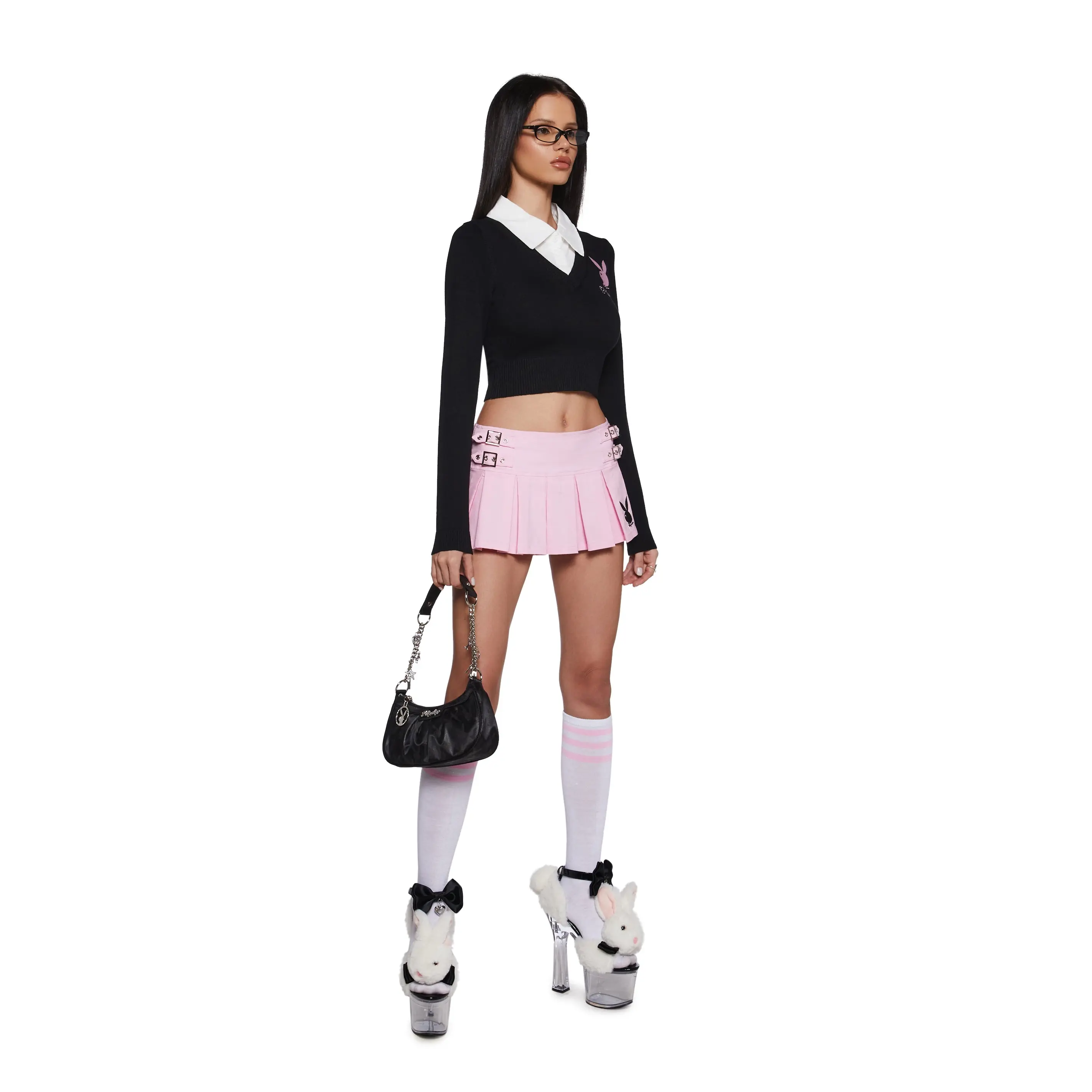 Look sexy and preppy with this sweater that has a knit construction, an attached twill collared neckline, a button placket, a ribbed trim, a cropped fit, and an embroidered Playboy Bunny logo on the chest.