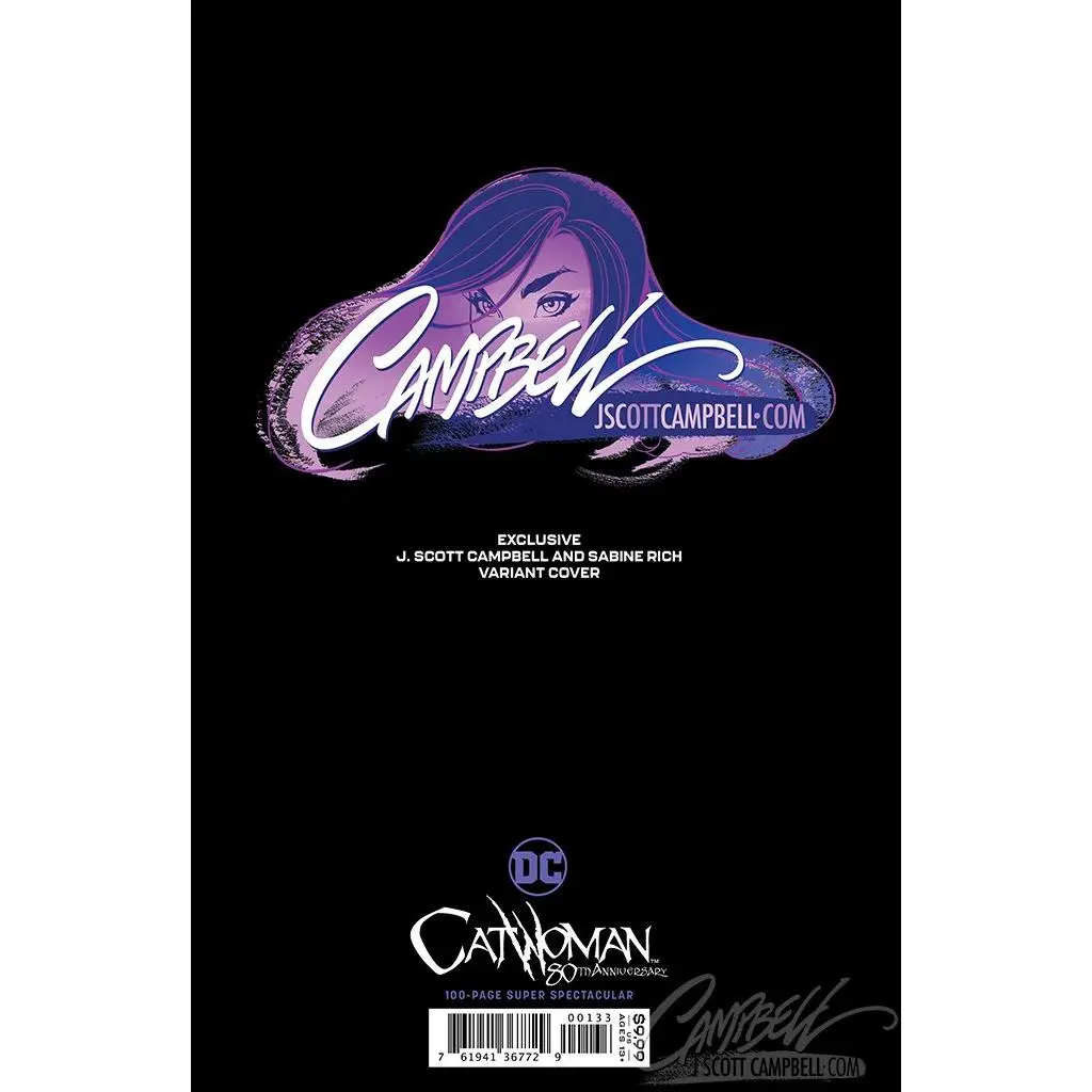 Order your copies of Catwoman 80th Anniversary EXCLUSIVE Cover A featuring cover artwork by J. Scott Campbell and colors by Sabine Rich. A JSC EXCLUSIVE! Signed and unsigned copies are available.
