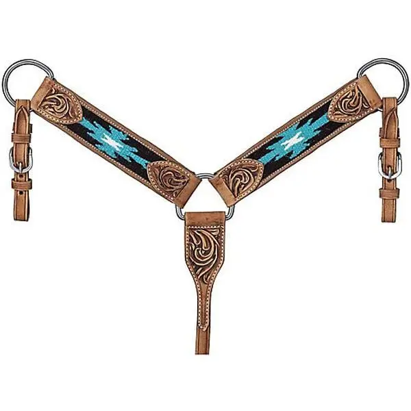 Stand out while riding the ranch or in the arena with this stunning premium leather mini breast collar. The hand-woven inlays feature turquoise accented Aztec designs for a truly western look. Complete with traditional leather tooled accents, durable stainless steel hardware, and a refined single stitched border. Paired with the Aztec headstall, this breast collar will surely give your horse the ranch work look.