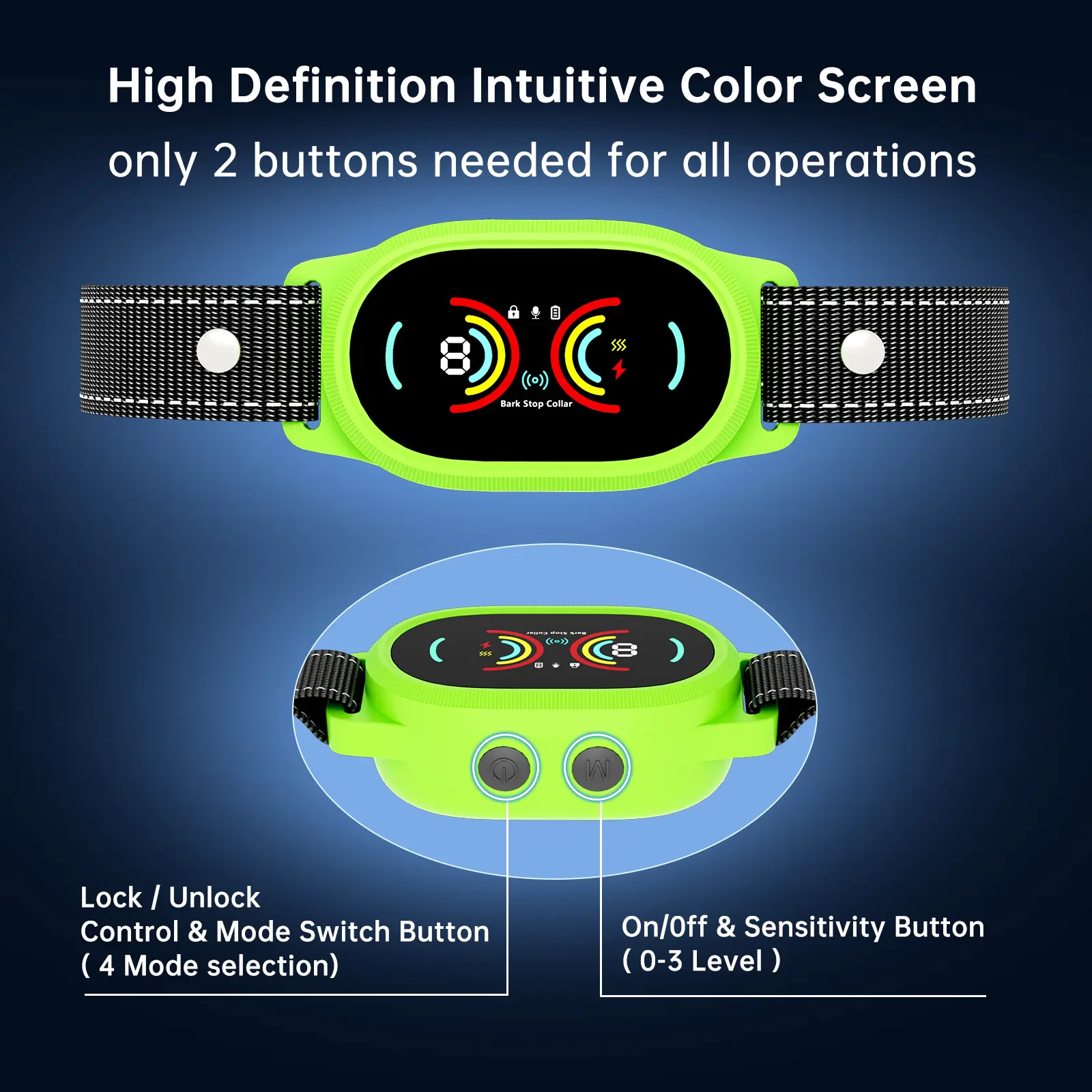 Humanized Settings: Bark collars is equipped with 2 button and display screen, Press Power button for 2 seconds turn on or turn off the device,Press and hold the " M " button for 2 seconds is lock or unlock the device, Each brief press of the power button adjusts thesensitivity setting sequentially from 0 up to 3, Briefly press “ M " button offers 4 training mode setting: shock + beep, vibration + shock, beep + vibration,beep + vibration + shock