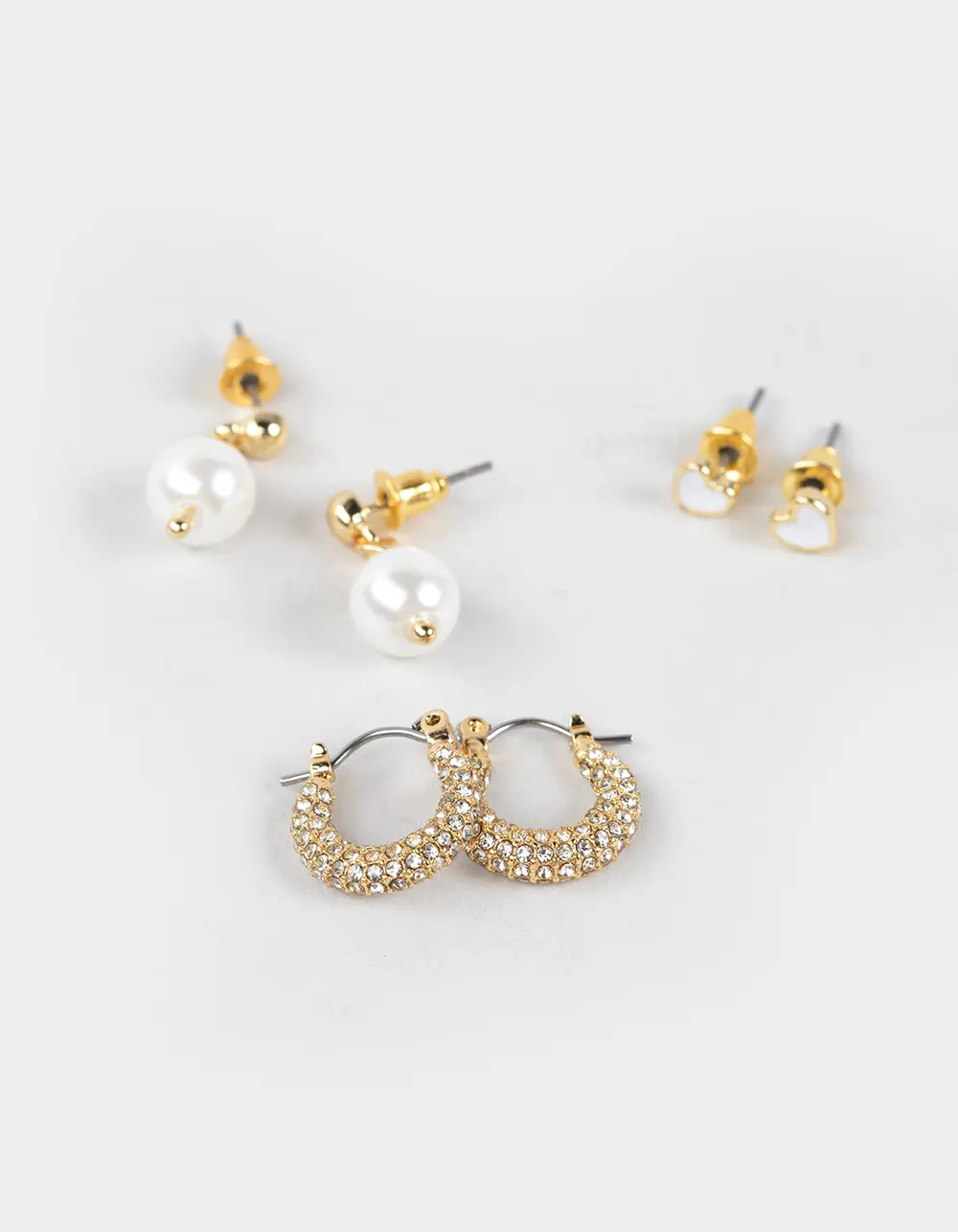 Full Tilt 3 Pack 14K Gold Dipped Heart Pearl Earrings. Includes 3 pairs of 14K gold dipped earrings - one pair of heart earrings, hoop earrings with rhinestone accents, and faux pearl earrings. Set includes a soft pouch for storage. Not intended for children 12 and under. Imported. CALIFORNIA PROPOSITION 65 WARNING: This product can expose you to chemicals, including lead which is known to the State of California to cause cancer or birth defects or other reproductive harm. For more information go to www.P65Warnings.ca.gov.