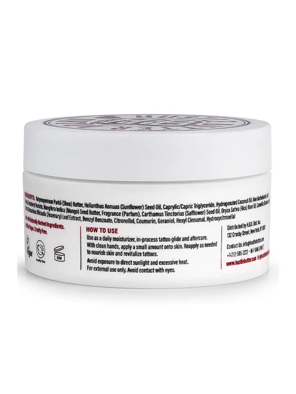 Hustle Butter Tattoo Balm is a best-selling tattoo glide and aftercare balm, designed for both artists and collectors. This luxurious, buttery formula is crafted with naturally derived, vegan ingredients like shea butter, coconut oil, and mango seed butter, providing intense hydration and skin nourishment.