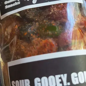 Corn Syrup (from Corn), Sugar (from Beets), Water, Gelatin, Chamoy Sauce (dried apricots, dried hibiscus flower, dried prunes, Chili Powder, Special Chili Blend, Lime Juice, Orange Juice), Citric Acid, Artificial Flavor, Lactic Acid, Pectin(Derived from Fruits), Titanium Dioxide (Color), FD&C Yellow 5, Red 4