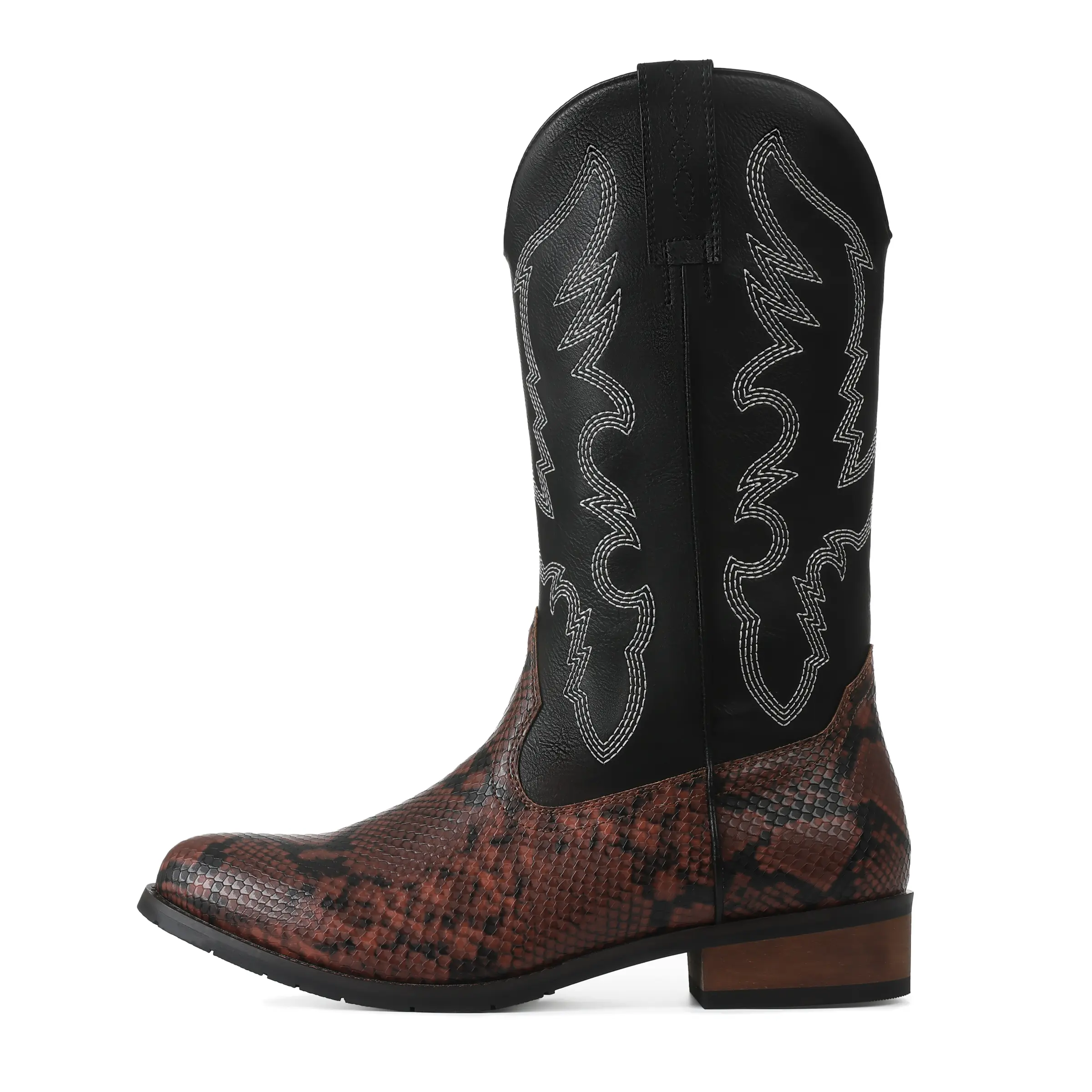 CELNEPHO Mens Cowboy Boots Pointed Toe Classic Embroidery Chunky Block Heel Mid Calf Boots Easy Pull on Tabs Western Vintage Country Work Outdoor Festival Riding Durable Boot