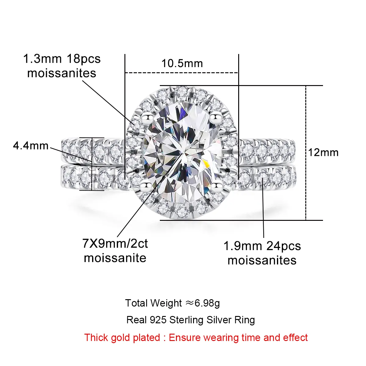 ·【Product Details】:The main stone is a moissanite that sparkles with unparalleled brilliance. With a total weight of 2ct, the ring is available in sizes 4 to 10 to better suit the needs of different people.