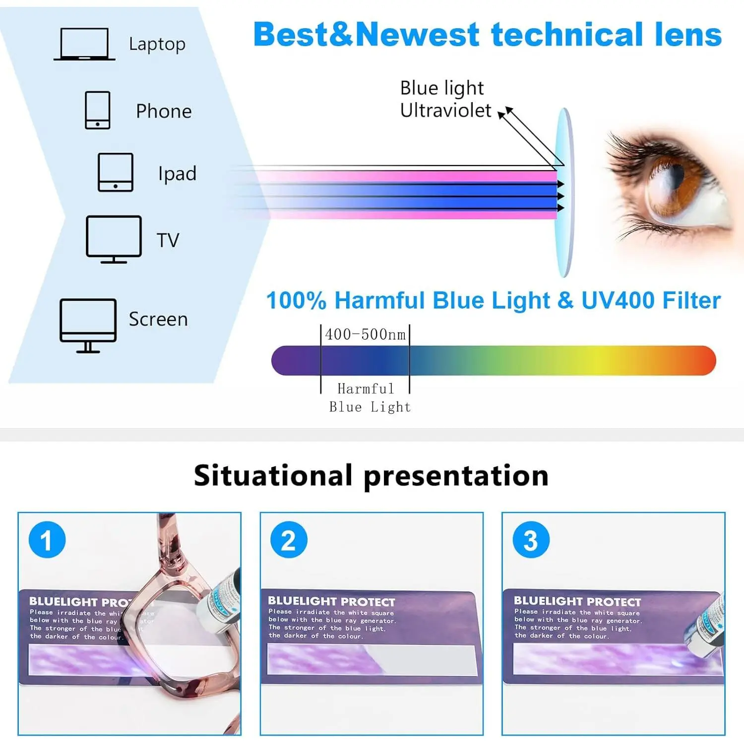 Anti Blue Light Glasse: Blue light blocking lenses with UV400 protection block more than 95% of harmful blue light, reducing exposure to blue light from digital electronics and reading.