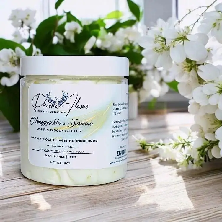 Indulge in the luxurious scent of honeysuckle and jasmine with our Whipped Body Butter. Let the long lasting fragrance transport you to a whimsical garden filled with blooming flowers and sweet musk. This decadent body butter is expertly crafted to nourish your skin, leaving it feeling hydrated, soft, and beautifully scented all day long.