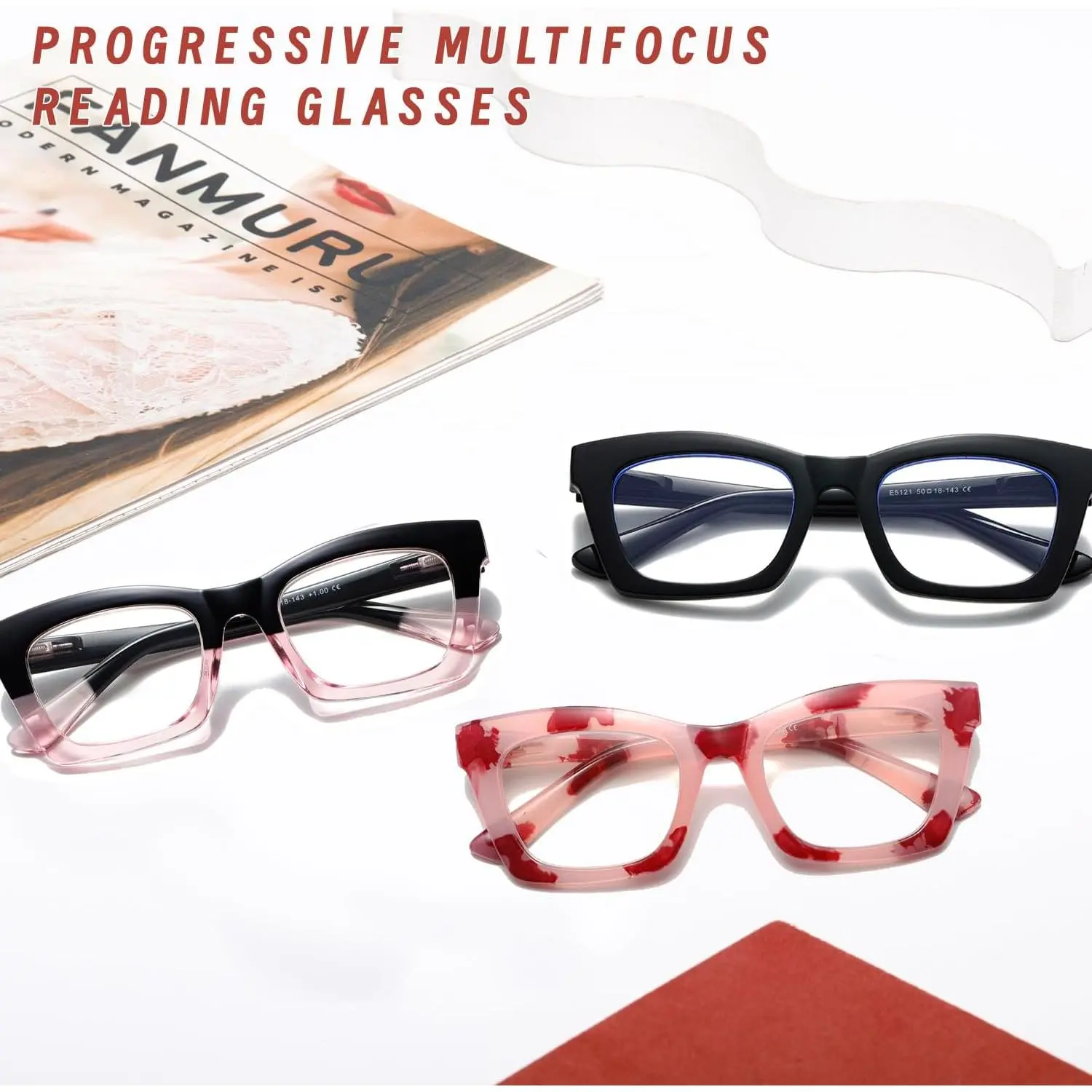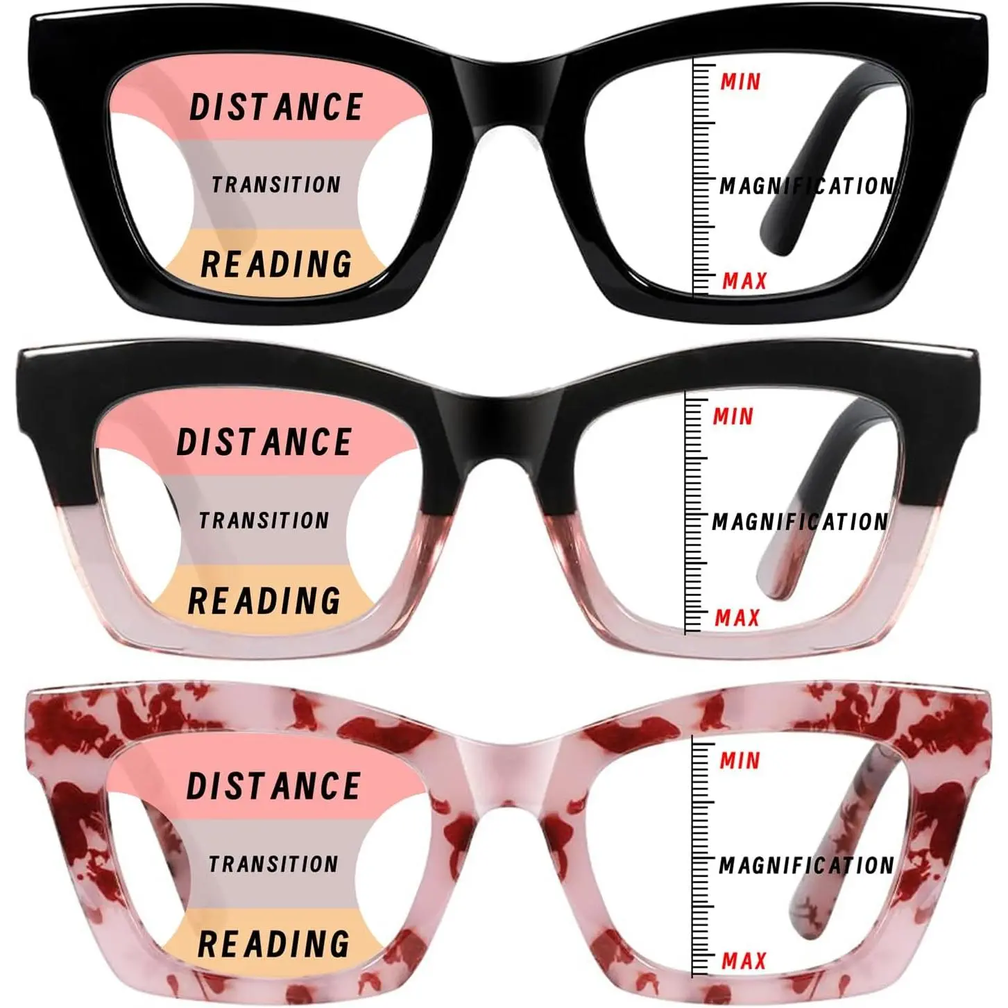 Progressive multifocus glasses for all your need. The bottom part of the lens is full-power magnification, then used for nearly distance reading. The middle part is slightly reduced power magnification for working on computer, watching TV, etc. Top part is half-power magnification for walking, shopping and so on. It means that you can wear the glasses anytime and anywhere.