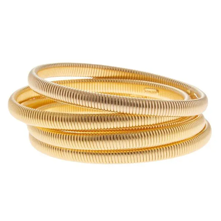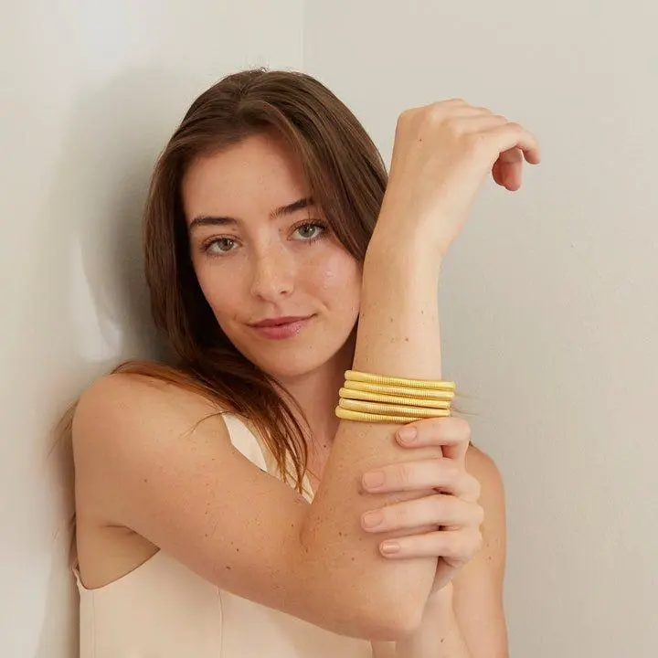 Cheers to the Prosecco bangles from our Aperitivo Collection. This set of 5 thin, easy-to-wear bracelets is perfect for wearing alone or mixing with your favorite concoction of jewelry. Width: 6 mm each. Diameter: 2.5". Materials: 24K gold-plated brass. All Ben-Amun jewelry is handcrafted and made to order in NYC; please allow 7-14 days for production before the anticipated ship date.