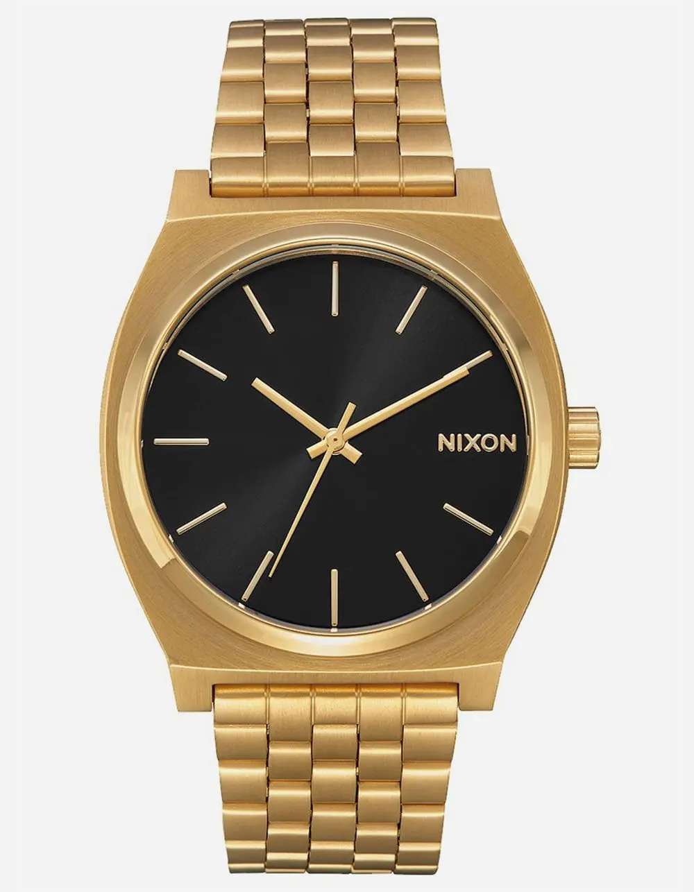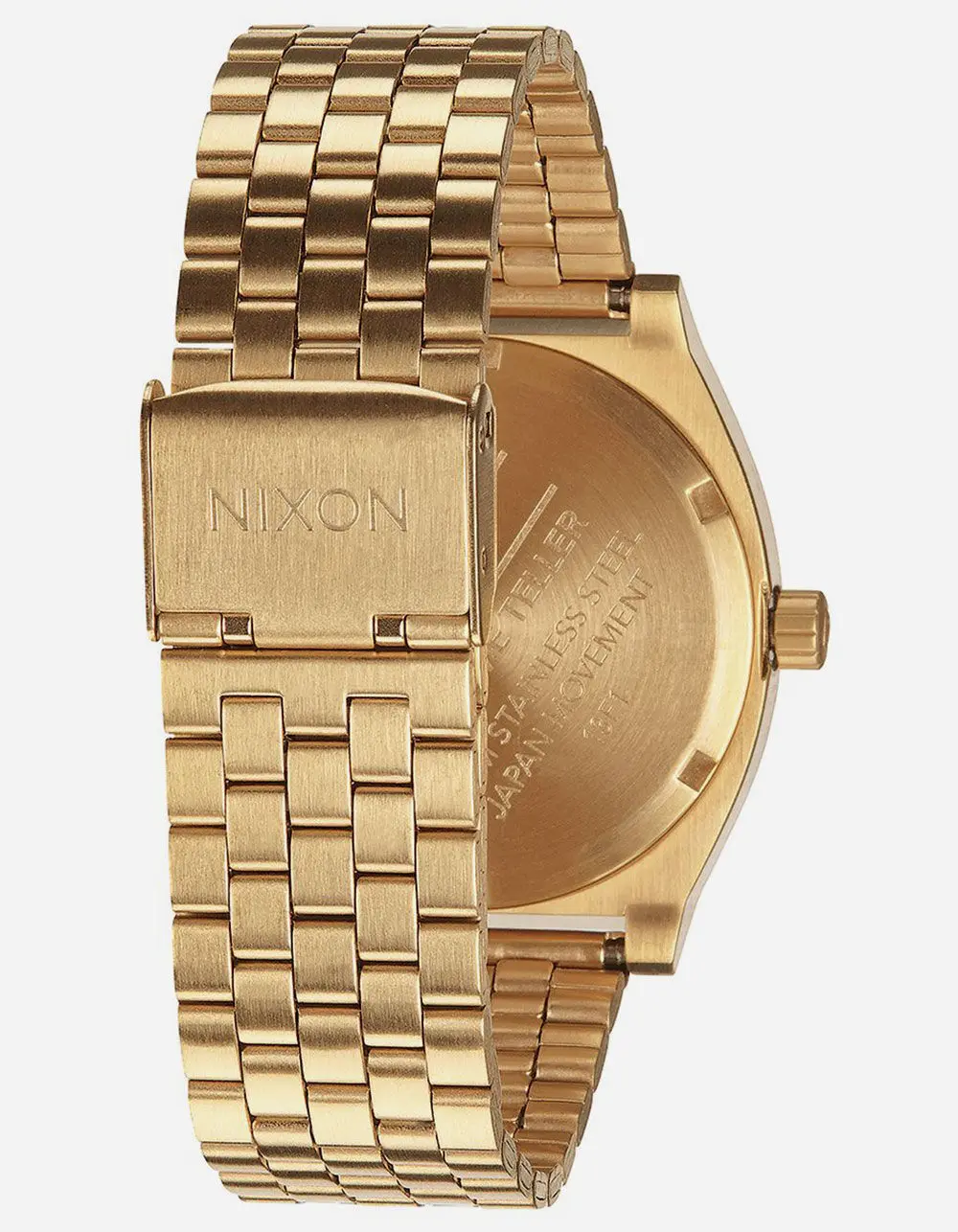 Nixon The Time Teller watch. Miyota Japanese quartz 3 hand movement. The dial includes applied indices, and custom molded hands. 37 mm, 100 meter, custom solid stainless steel case, solid stainless steel fixed bezel, hardened mineral crystal, triple gasket stainless steel crown, stainless steel screw down caseback and spring pin lugs. 13-18 mm tapered custom 5 link stainless steel jewelry style bracelet and stainless steel locking clasp. Imported. | NIXON Time Teller Watch