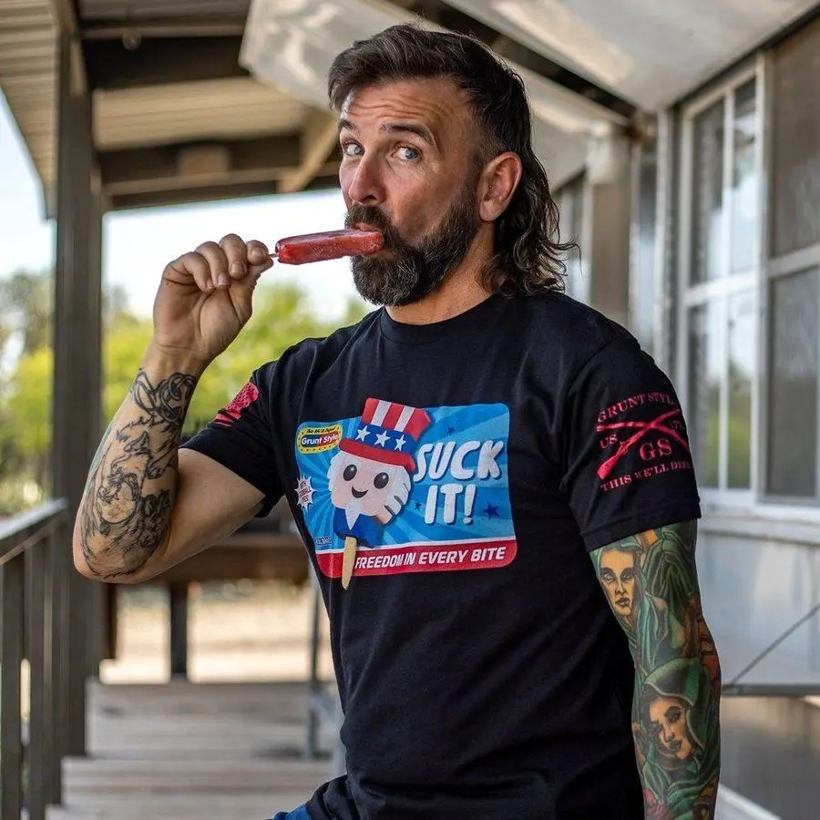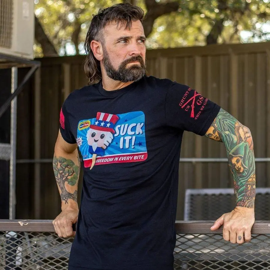 The 'Suck It' T-Shirt in Black packs Freedom in Every Bite. With its bold design, this shirt blends the grunt style twist and unapologetic patriotism into every bite. Because nothing is better than freedom, and if you're not that down with that, we’ve got two words for you: Suck it.Our Loud and Proud Shirts are crafted with the following details: