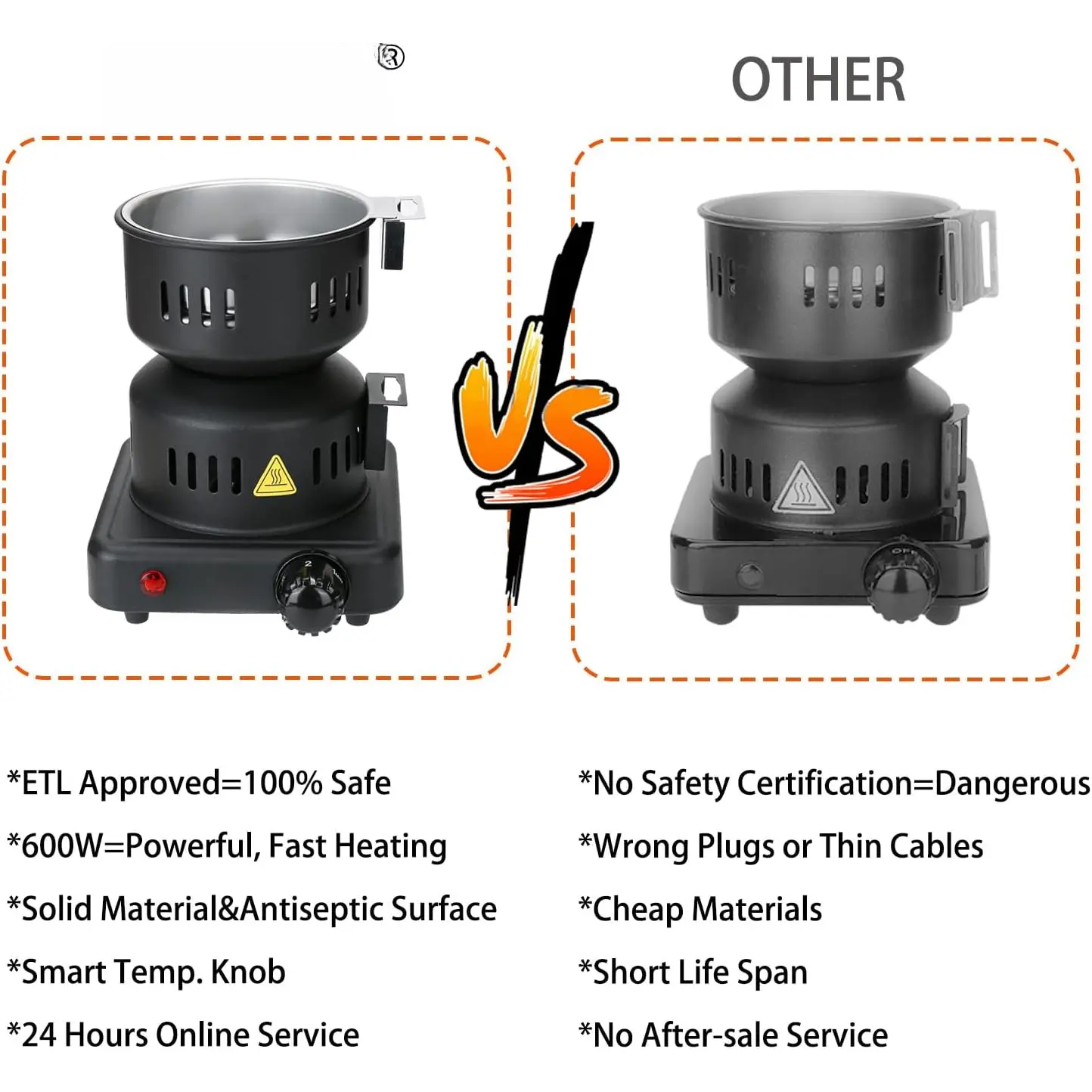 ✅ 【ETL Approved-Safety Gurantte 】:ETL Approved -120V, 600W Fast Coal Burner , electric stove is safe, Match overheating & circuit protection. 4.9ft convenient & Safe for indoor or outdoor coal burner stove electric burner.